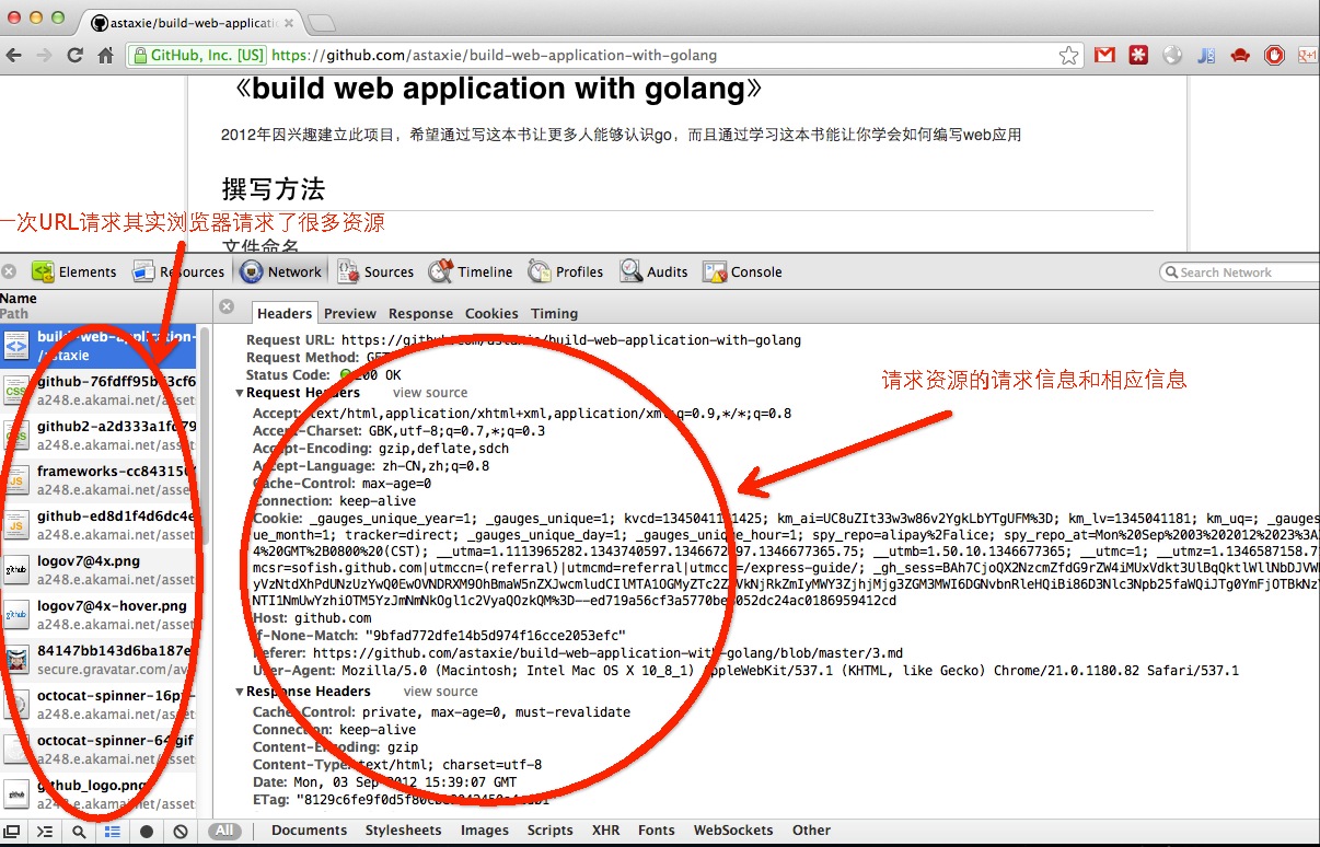 We can see the entire communication process between client and server from the above picture. You may notice that there are many resource files in the list; these are called static files, and Go has specialized processing methods for these files.