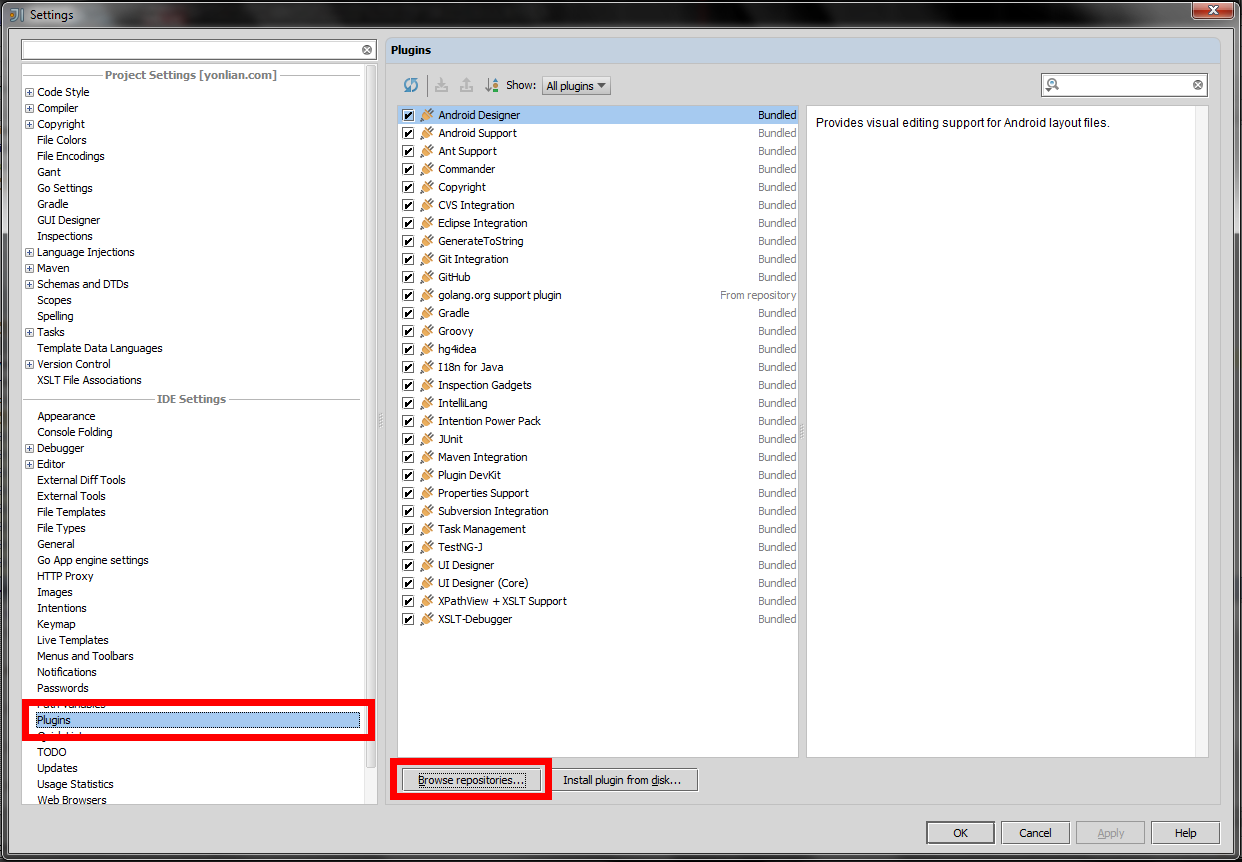 Goプラグインをインストールし、FileメニューのSettingをクリックします。Pluginsを探したら、Browser repoボタンをクリックします。中国国内のユーザはおそらくエラーが出るかもしれませんが、自分で解決してくれよな。