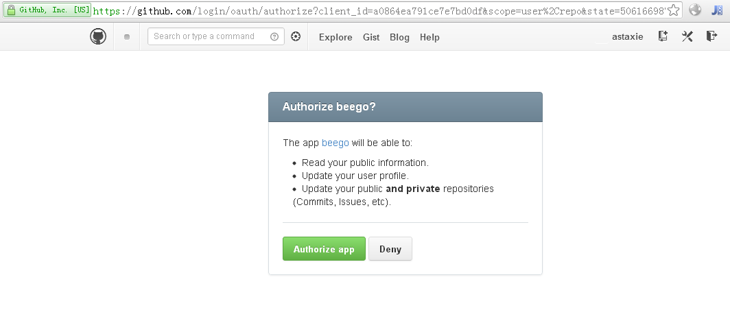 GithubControllerlanding page:package controllers import ( "github.com/astaxie/beego" "github.com/bradrydzewski/go.auth" ) const ( githubClientKey = "a0864ea791ce7e7bd0df" githubSecretKey = "a0ec09a647a688a64a28f6190b5a0d2705df56ca" ) type GithubController struct { beego.Controller } func (this *GithubController) Get() { // set the auth parameters auth.Config.CookieSecret = []byte("7H9xiimk2QdTdYI7rDddfJeV") auth.Config.LoginSuccessRedirect = "/mainpage" auth.Config.CookieSecure = false githubHandler := auth.Github(githubClientKey, githubSecretKey) githubHandler.ServeHTTP(this.Ctx.ResponseWriter, this.Ctx.Request) } -