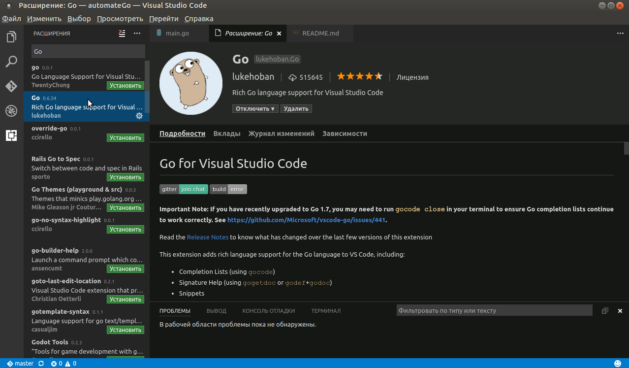 main.goи проверьте, правильно ли подсвечивается синтаксис. Напечатайтеimportи проверьте, правильно ли работает автодополнение кода. После того, как Вы ввелиimport "fmt", напечатайтеfmt.где-нибудь после выраженияimportи проверьте, работает ли автодополнение для функций.Если все работает, это значит, что Вы все настроили правильно.