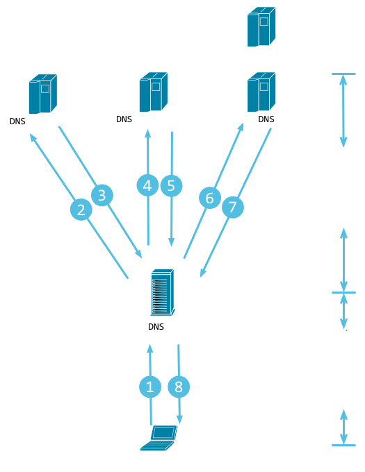 6. Если DNS сервер является рекурсивным, он отправляет запрос DNS серверу более высоко уровня. Если DNS сервер более высокого уровня также не знает имя домена, он продолжает посылать запрос на более высокий уровень. Если локальный DNS является рекурсивным, разрешенное в IP адрес доменное имя возвращается к локальному DNS серверу, который, в свою очередь, отправляет его клиенту.