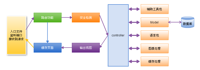 5. 控制器裝載模型、核心函式庫、輔助函式,以及任何處理特定請求所需的其它資源,控制器主要負責處理業務邏輯。