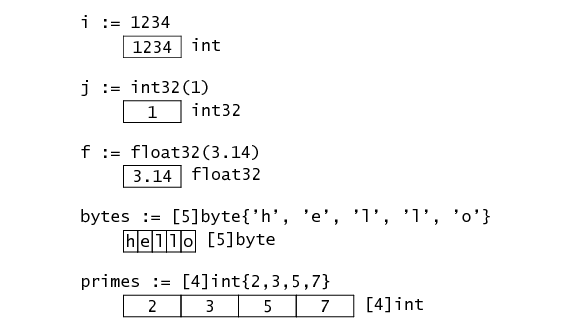 var ar = [10]byte {'a', 'b', 'c', 'd', 'e', 'f', 'g', 'h', 'i', 'j'}