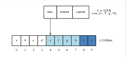 a_slice = array[3:7] // a_slice包含元素: d,e,f,g,len=4,cap=8