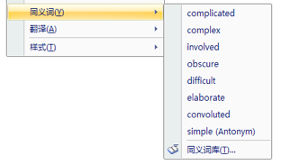 在任一英文单词上点击鼠标右键,都可以看到一个 “同义词” 快捷菜单。可以通过选中菜单子项而将文档中的词换为该同义词:
