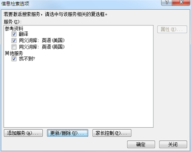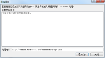 而后在底部 “地址(A)” 之后的文字输入框里输入:“http://office.microsoft.com/Research/query.asmx” 而后按“添加”按钮: