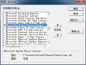这一步稍微复杂一点,因为要为 Word 添加宏代码。 在 Word 程序中,先关闭所有文档,之后按快捷键 “Alt+F11” 呼出 VBA 编辑器。 从菜单 “工具(T)” 中选择 “引用(R)”,在随之跳出的对话框中选中 “Microsoft Speech Object Library”,而后在之前的复选框里打勾:
