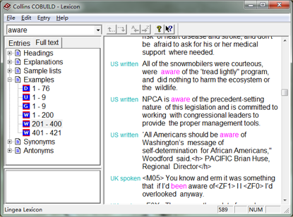 柯林斯(Collins)词典也是市面上唯一一个自带可查询语料库的词典。查每个单词的时候,释义中有相应的例句之外,在 “Full text” 标签里有个 “Examples”通常都有几十个甚至几百个例句其中的例词被红色高亮并且在例句之前标注了究竟是 UK written、 UK spoken、US written、US spoken 之中的哪一种。“Example” 之下有若干个图标,其中: