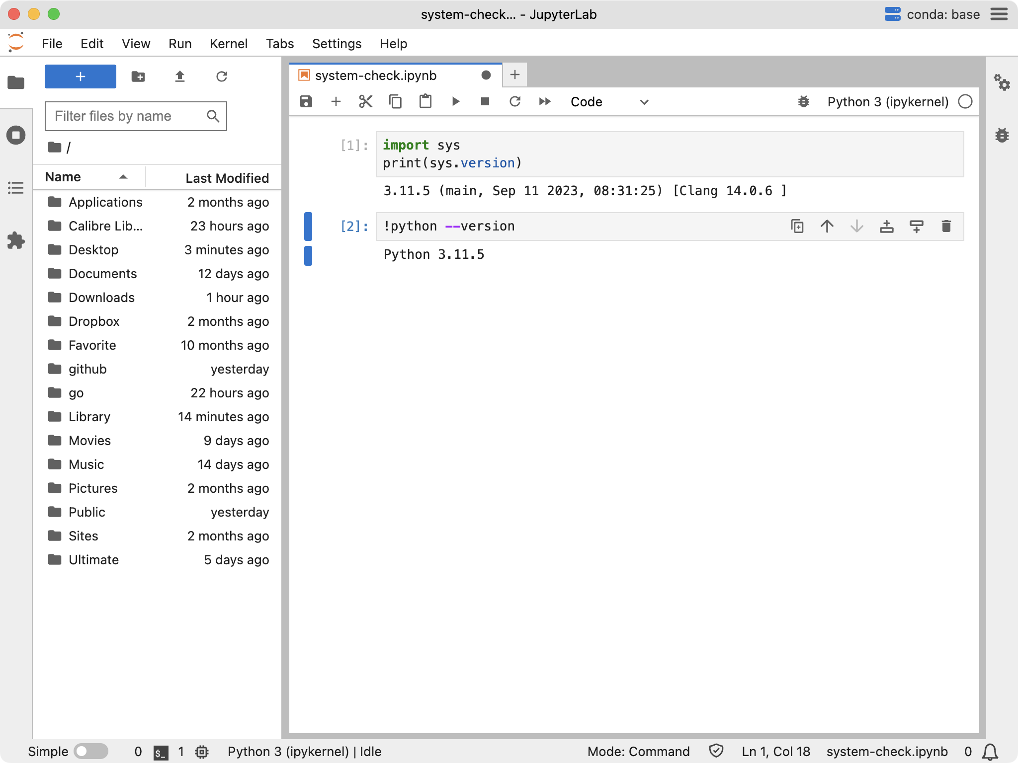 想要使用更高版本的 Python 及其环境比如Python 3.11.5,就得用我们自己在系统上使用 conda 安装的 Python 环境。
