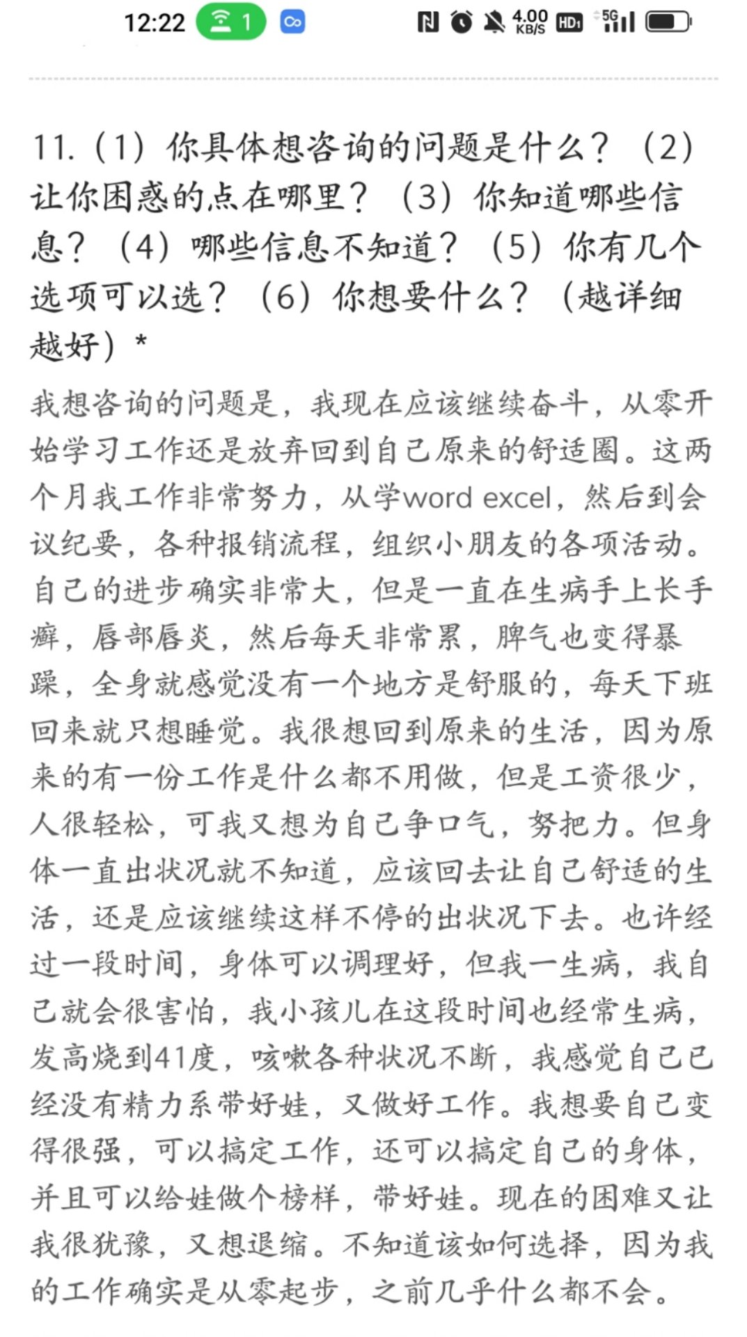 - 首先对于你的身体来看,它确实出现了问题,为什么?因为你现在遇到新的状况,说白了就是有点扛不住,所以这个时候你要怎么办?你每天至少给自己留半个小时,应该还是有的。嗯,你可以冥想或者选择慢跑,那其实通过这个身体这方面的,这个算是冥想的还是这个慢跑的?这通过这个方式的话,其实你的身体是可以提高这个免疫力,那这种状况下的话,其实你是可以有助于你扛过这个困难的,这个阶段这是第一个方面,第二个方面的话你要和你的家里人去谈一下,就是什么这个阶段你刚开始工作就是非常困难的,就是会有各种各样的这个挑战的,你要跟他们勇于求助说这个阶段孩子这方面就得家里人得多操心。