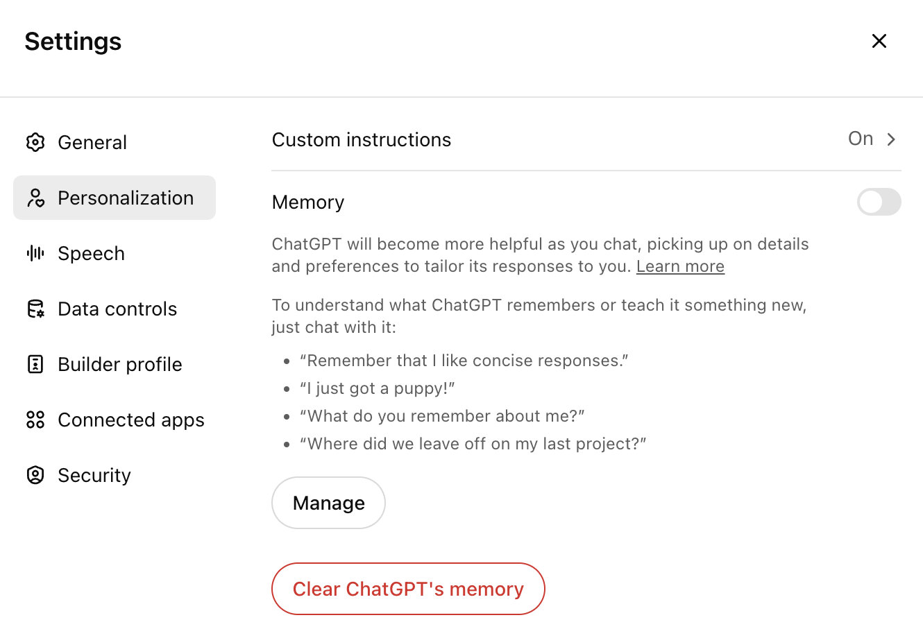 另外呢我经过一段时间的使用呢,发现哈我也许应该关掉这个设置里的memory开关。对啊,就是这个chaGPT越来越了解我这个特性呢,其实对于坚决不放弃思考的我来说,其实不太实用。任由它不断的顺应我的思路的结果是什么呢?就是在不知不觉之间,我自己的长期思路会限制chaGP的自由发挥。反过来呢更可能因此造成我自己被自己禁锢。对?于是呢。嗯,我就关掉了那个memory按钮。
