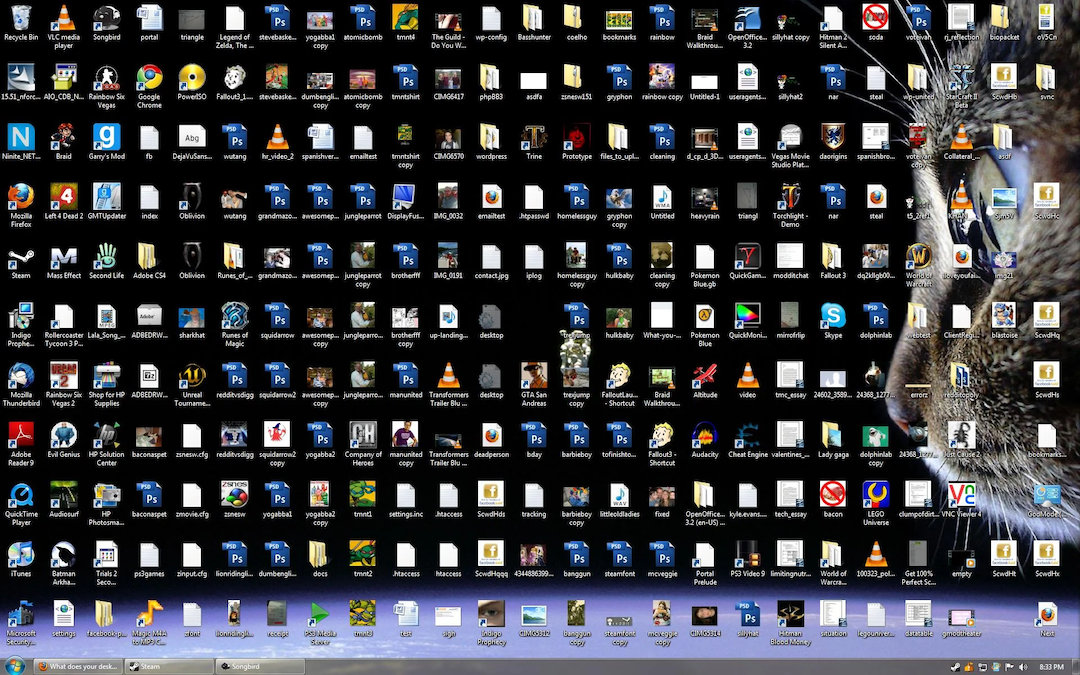 再比如说哈尝试使用呃浏览器,打开各种本地文件啊,再比如说点击广告链接的时候,以为是内容的一部分啊。那对于操作系统呢啊就更加的多元化。这个特别常见啊,就是把所有的文件都放在桌面上,把文件名当做版本管理器啊,只会用右键复制粘贴,从来不知道任何快捷键。啊,那么我猜你也无数次的看到过哈,类似这样的呃计算机桌面。