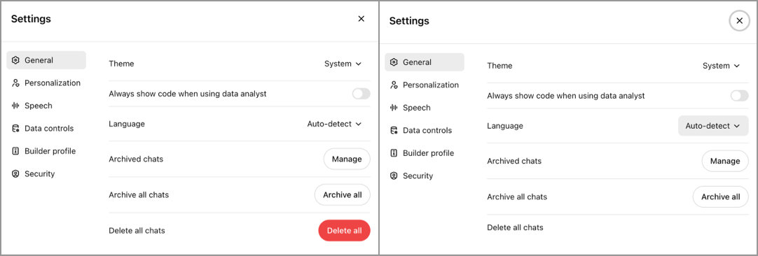Yeah.你看呃植入了插入了这段自定义代码之后呢啊你看这张图片哈,左面是原本的呃设置对话框里的呃显示,你会看到一个红色的delete or chatdeelete all按钮,对吧?然后就是我误点了那个还居然点了确定,所以呢我所有聊天记录都丢了一次,对吧?于是呢我就气坏了怎么办啊?我用stlish插件插入了一段自定义代码。然后你再看我现在再打开,在age里再打开这个这个setting dialogueog啊,你就看右下角是没有那个红色的键的对吧?我想悟点也不可能,因为那个键已经看不着了。