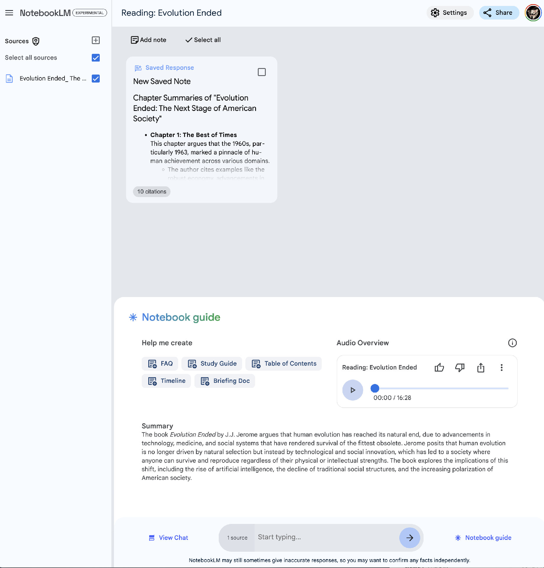 .最近几个月哈,他还增加了一个这个这个叫audio overview的这个功能,就是你本书扔进去哈,它竟然会跟你生成一个podcast一样的对话啊,两个人对话,然后呢啊把这本书大致给你讲一遍,所以那些这个读书博主啊,都该失业了个屁的了,对吧?当然了,我刚才跟大家说过哈,就是我们不会因为有人工智能工具而舍弃阅读的乐趣,对吧。Yeah.并且呢最为重要的是我们不会因为有人工智能,就使我们的大脑失去锻炼的机会啊,然后呢产生萎缩的情况。对?所以这节课的内容呢啊比较的特殊啊,在一个讲人工智能应用的这个课程里面啊,竟然有一整节课在告诉你说,在这儿你不要用人工智能,尽量不要用,要用也要小心利用。好,我们这节课结束了。然后呢,我们下节课再讲。え。