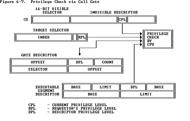 As Figure 6-7 shows, four different privilege levels are used to check the validity of a control transfer via a call gate: