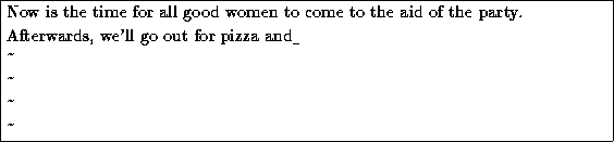 $key = q/{}fboxminipage0.8textwidthNowisthetimeforallgoodwomentocometotheaidoftheparty.Afterwards,we'llgooutforpizzaandunderline~~~~minipage{}/;