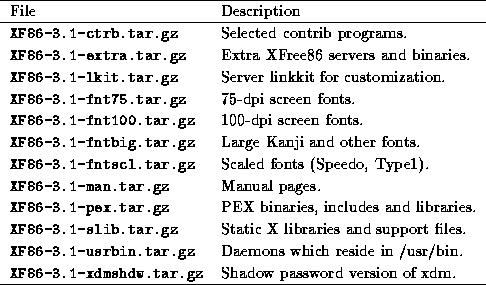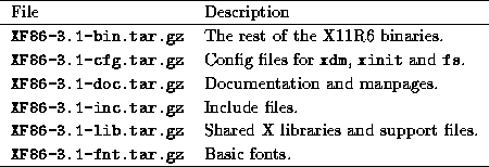 $key = q/{tabular}lllhlineFile;SPM_amp;DescriptionhlinettXF86-3.1-bin.tar.gz;SPM_amp;TherestoftheX11R6binaries.ttXF86-3.1-cfg.tar.gz;SPM_amp;Configfilesforttxdm,ttxinitandttfs.ttXF86-3.1-doc.tar.gz;SPM_amp;Documentationandmanpages.ttXF86-3.1-inc.tar.gz;SPM_amp;Includefiles.ttXF86-3.1-lib.tar.gz;SPM_amp;SharedXlibrariesandsupportfiles.ttXF86-3.1-fnt.tar.gz;SPM_amp;Basicfonts.hline{tabular}/;