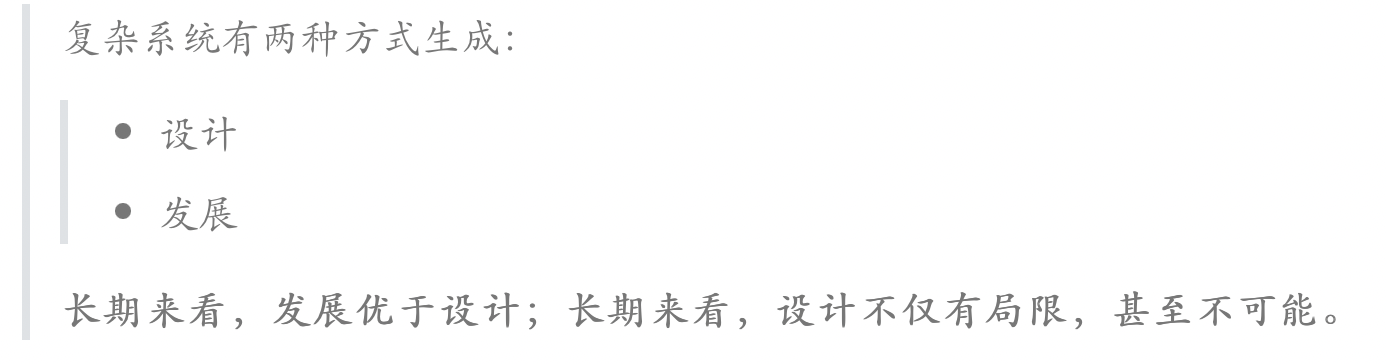关于复杂性科学究竟是什么,其实并不是我们这里要深入讨论的话题。 我们需要从这个领域里获得的启发,很简单很简单。 刚才我们已经啊大致的说过了,现在呢我们系统化的总结一下,就是复杂系统有两种方式生成,一种呢叫设计。 另外一种呢叫发展。 长期来看呢,发展优于设计,长期来看呢,设计不仅有局限,甚至不可能。 。