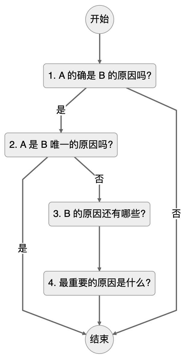 所以呢我们可以用这个流程图啊去看这四个问题的执行流程啊,上来呢我们要看A和B构成因果关系吗? 这个时候第一个问题,我们问的是AA的确是B的原因吗? 如果不是的话呢,这个分析就已经结束了。 如果是的话呢,我们接着再往下问,说A是B的唯一原因吗? 如果是的话,那这个问题又结束了。 如果不是的话呢,我们就需要接着问下去,B的原因还有哪些呢? 罗列出来之后呢,就要问那最重要的原因又是什么呢? 直至啊分析结束。 。