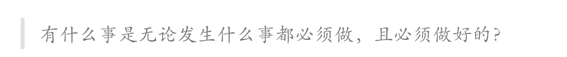 这个问题太重要了啊,值得你记录下来之后呢哈嗯放在任何显眼的地方,你要时常问自己有什么事儿是无论发生什么事都必须做的且必须做好的就这时间你生活当中总是有一些事情,无论外界发生了什么情况,无论你遇到了什么样的人,无论你遇到了什么样事,那都是你必须要做好的对 ? 举个例子啊,举个例子,那我作为家长对吧? 那我可能需要赚钱养家,对吧? 那你说外面地震了,我是不是还是要做这件事情,经济危机了,我是不是还要做这件事情,退一万步讲,我爹去世了,那我是不是还是要做这件事情,啊? 这种事情啊,没有己件的,你平时多想啊,比如说哈对我们发展论者来讲,无论发生了什么事情,我们都要发展呢,因为我们是发展论者。
