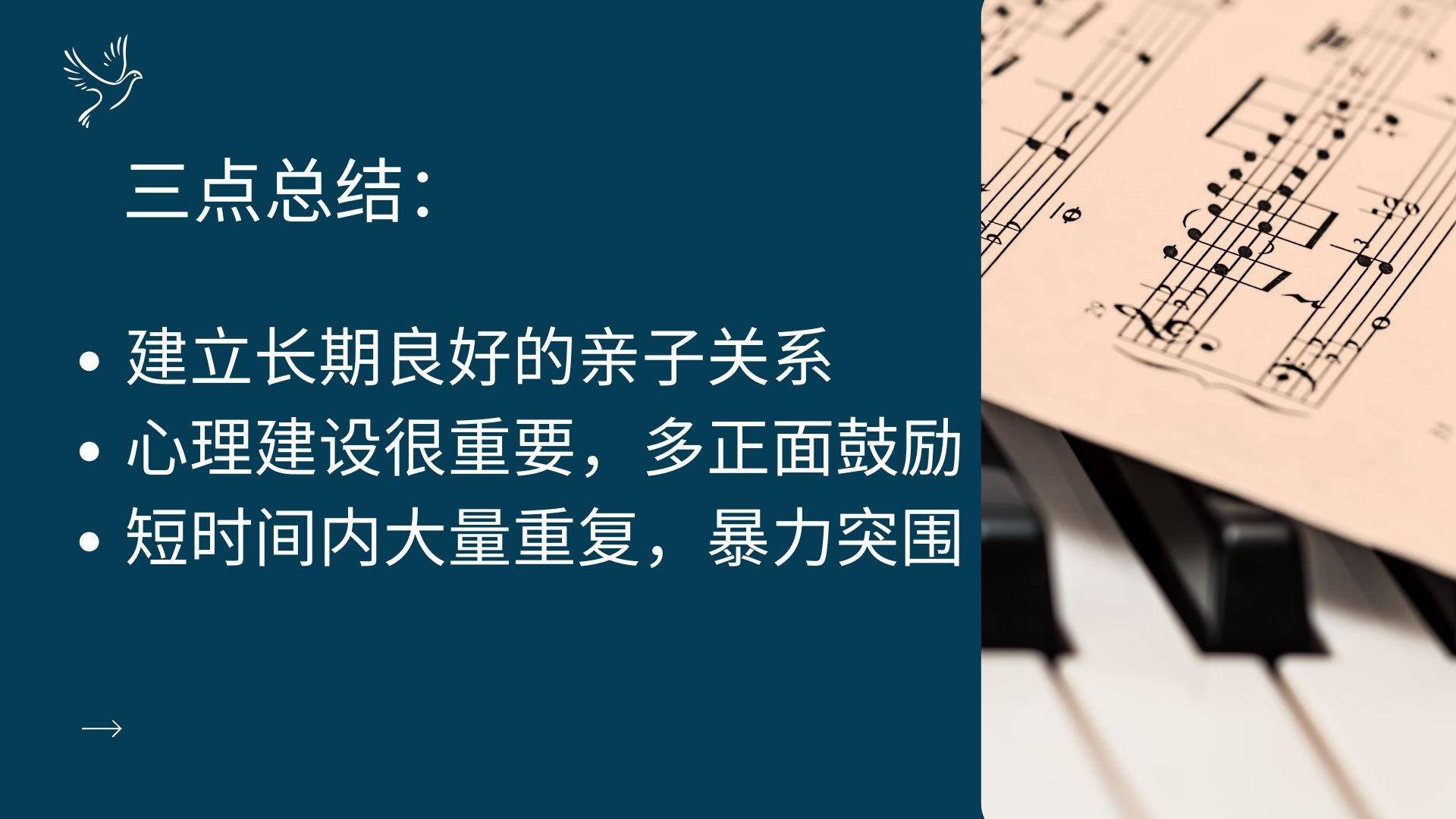 所以一开始就没让孩子从倒ra咪学起,直接就开始弹肖邦的黑剑练习曲。 因为这是一首十级的考级曲目。 孩子就是在练习这种大曲目的过程中学会了认识五线谱,学会了各种演奏技术,但是整个过程靠一阵强强心技肯定是不足以维持以后的学习的,在6月份放暑假前的这三个月,基本都是在做心理建设,建立练习习惯,。