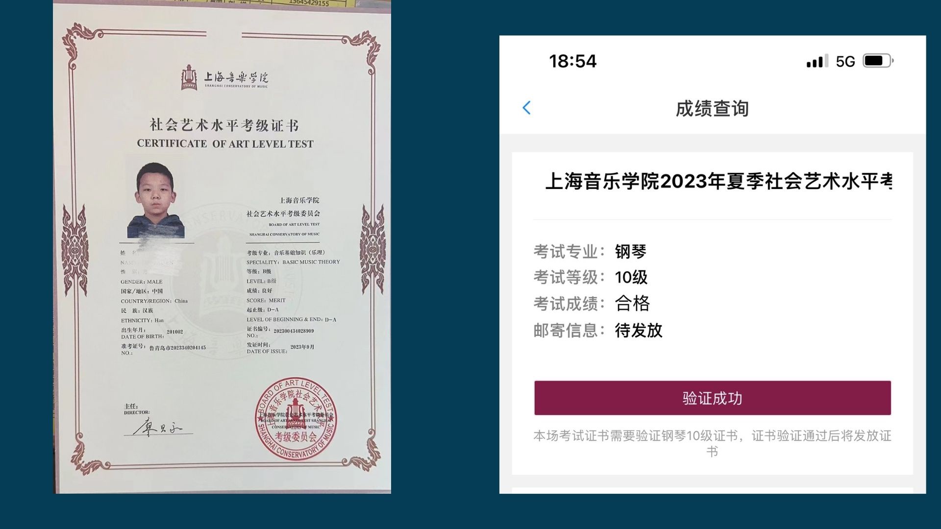 现在孩子换了个新的学习环境,又开始了正常的学校生活,他自己也觉得有了这次练琴的经历,认为自己只要想学什么都会学会,无非就是短时间内大量重复而已。 当然我们也收获了钢琴这个爱好,练琴已经成了孩子最大的乐趣,每天都会练习,感觉已经不把它当成练习了,而是一种放松,现在一个小时的练习轻松搞定。 当然,最终孩子的付出也得到了肯定。 阅离考考了个良好,十级演奏也顺利通过。