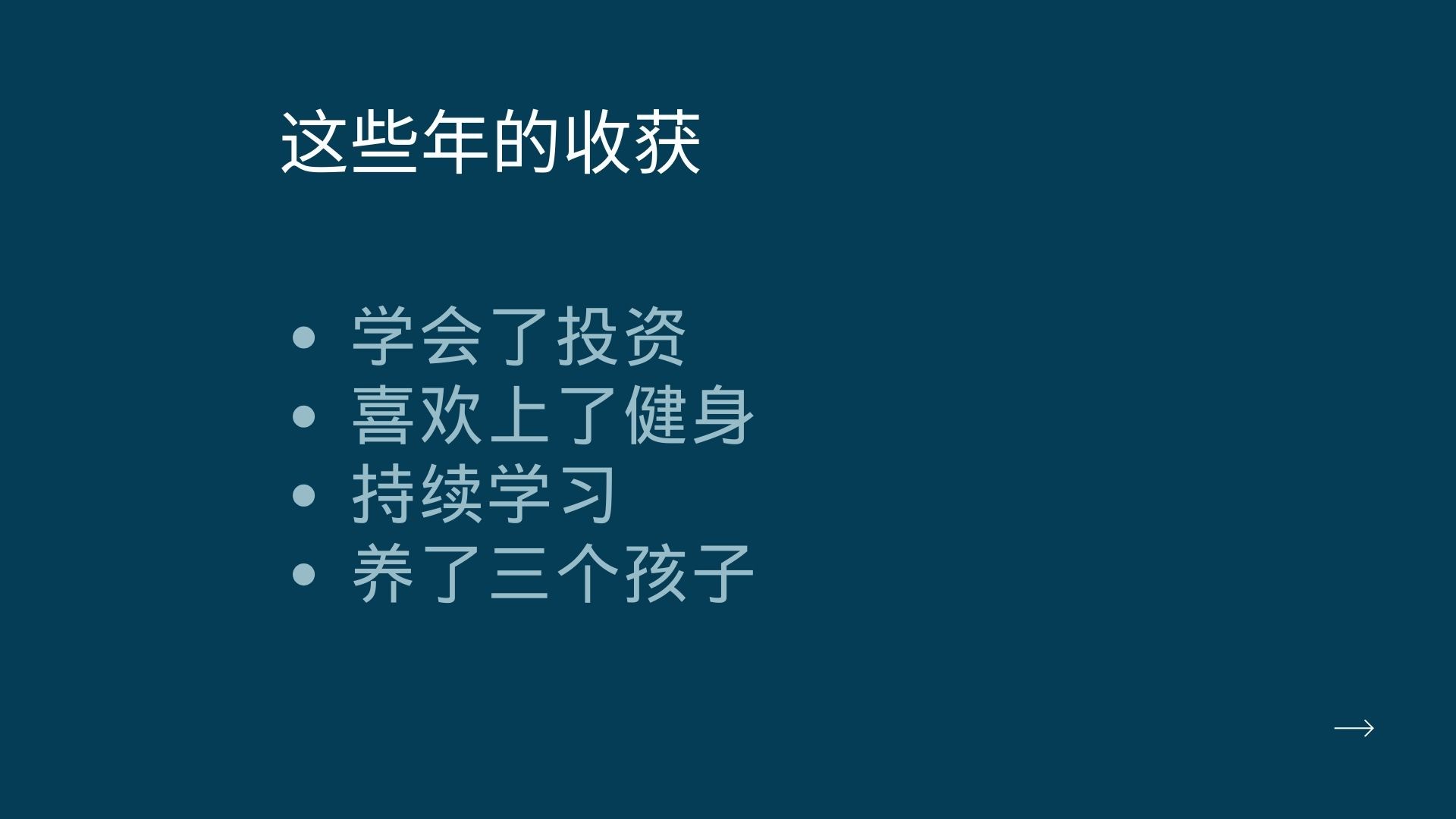 跟随校来老师学习已经有11年了。 在这1年中,我因为校来老师发生了很多变化,学了投资,喜欢上了健身,学会了用英语以及养了三个孩子。