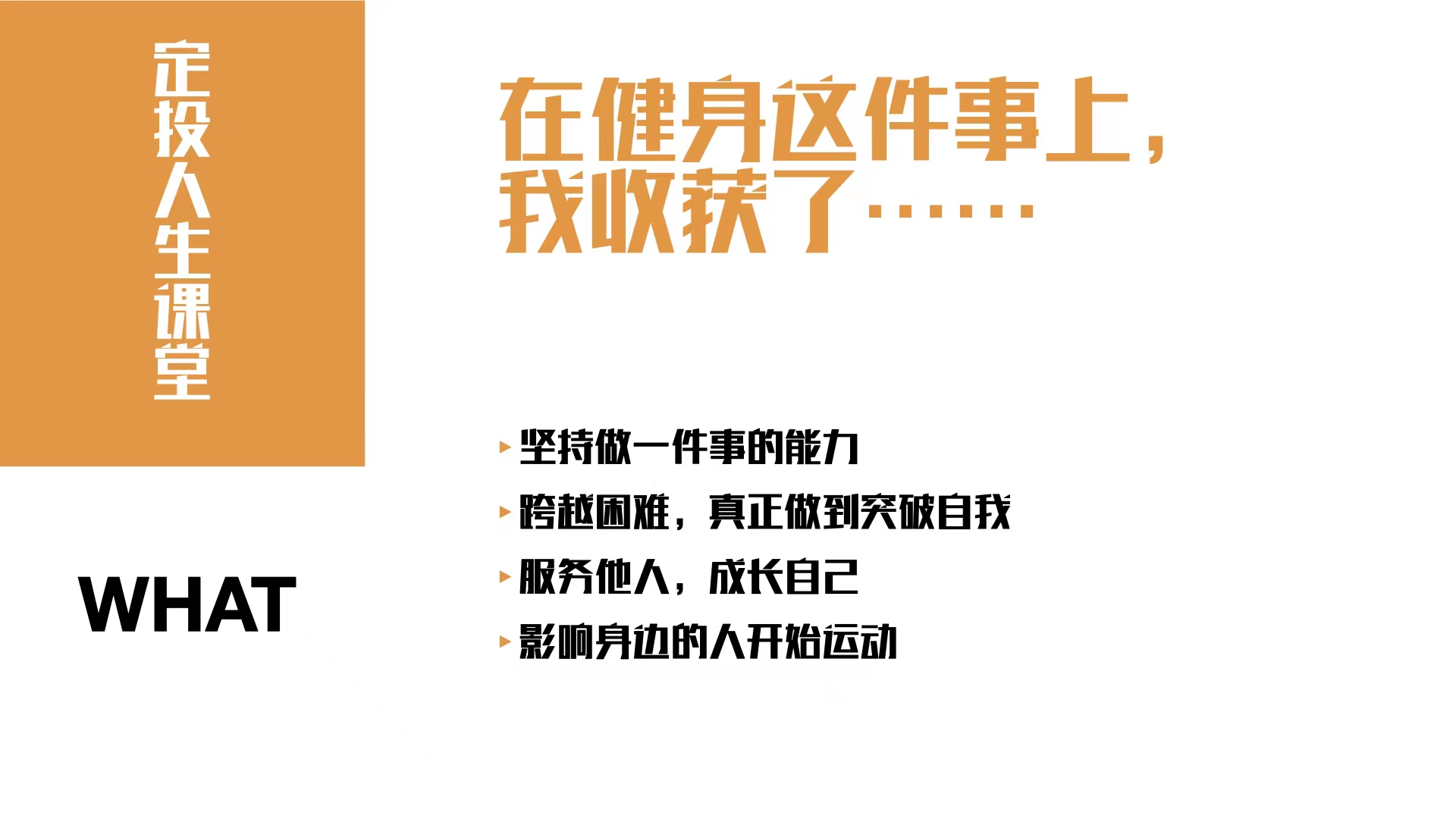 在健身这件事上,我收获到了坚持做一件事的能力,跨越困难到真正做到突破自我,服务他人,成长自己,影响身边的人开始运动。