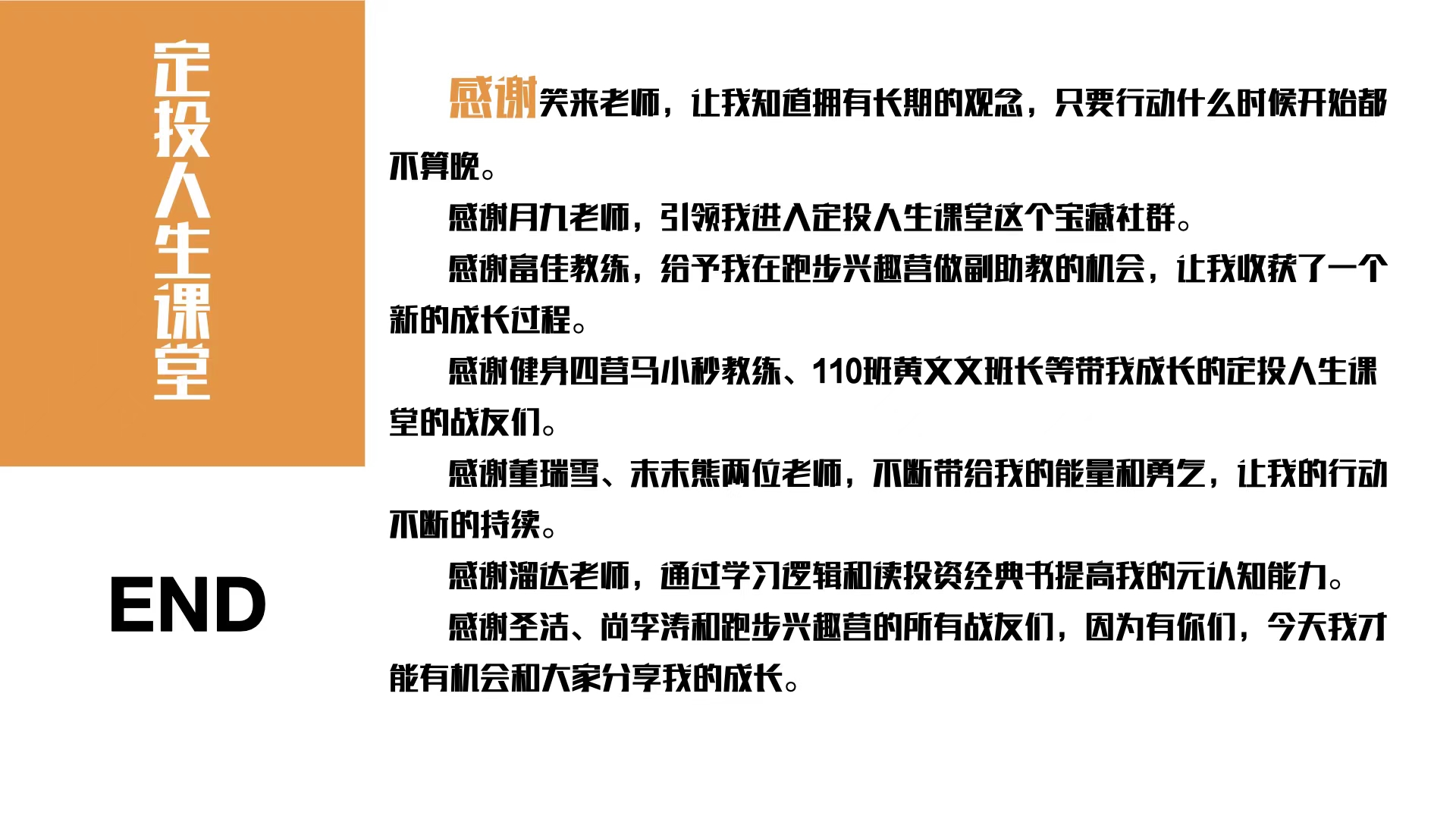 感谢健身试营马小苗教练的一直看见和鼓励,感谢110班黄文文班长等待我成长的定投人生课堂的战友们,感谢董瑞贤、莫毛熊两位老师,不但带给我的能量和勇气,让我的行动不断的持续,感谢溜达老师,通过学习罗技和读投资经典书,提高我的原认知能力,感谢圣洁单立涛和跑步兴趣赢得所有战友们 。 因为有你们今天我才能有机会和大家分享我的成长。