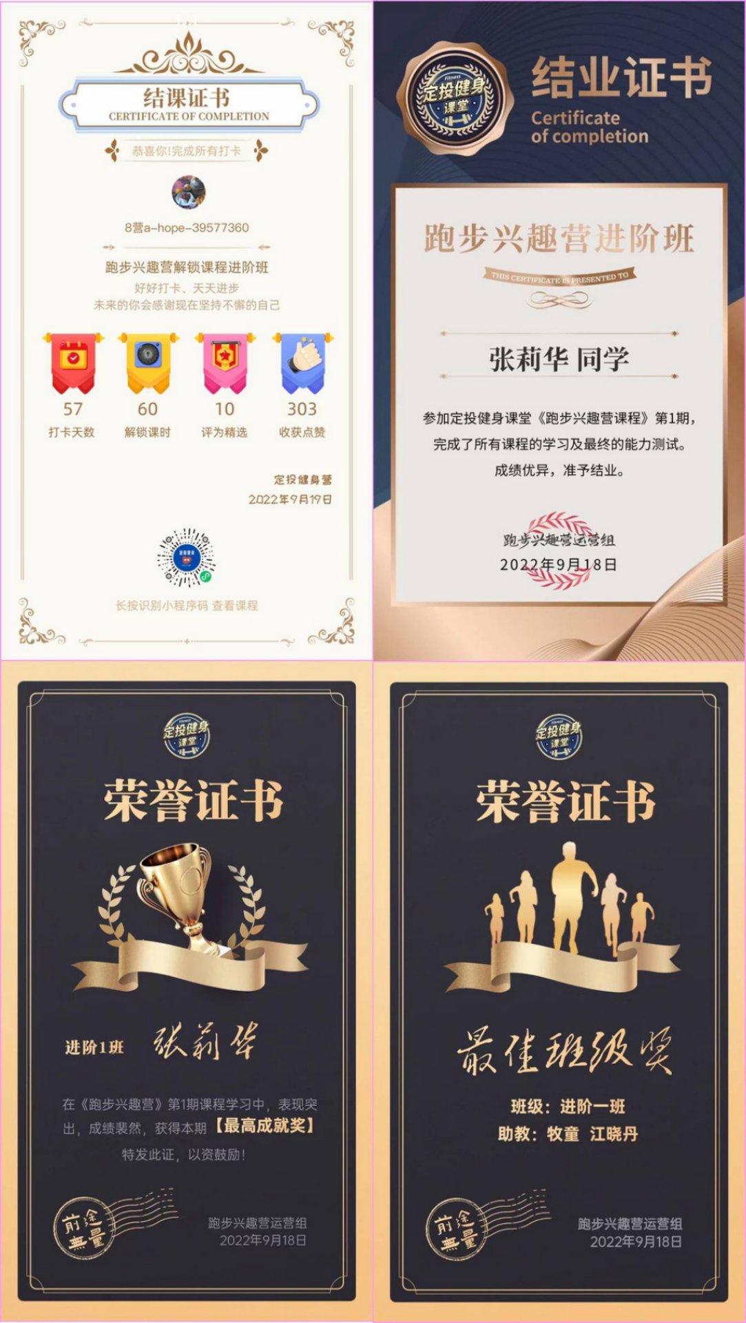跑步兴趣营一期结营。 我获得了最高成就奖。 当时我以为最多上镜领个奖就可以,但得知需要直播分享时,我第一个念头就是放弃奖项,心里斗争了很久,直播特别紧张,回放也不敢看。 有了第一次的直播经验,二期跑步兴趣营开启仪式上,我第二次直播分享,感觉好了很多,到第三次已经不太紧张了,进步非常明显,自己都感觉像变了一个人,同事看完直播评价说,可惜不能让我做汇报了,浪费了口才。 虽然是玩笑。 我从中听到了真心的肯定。