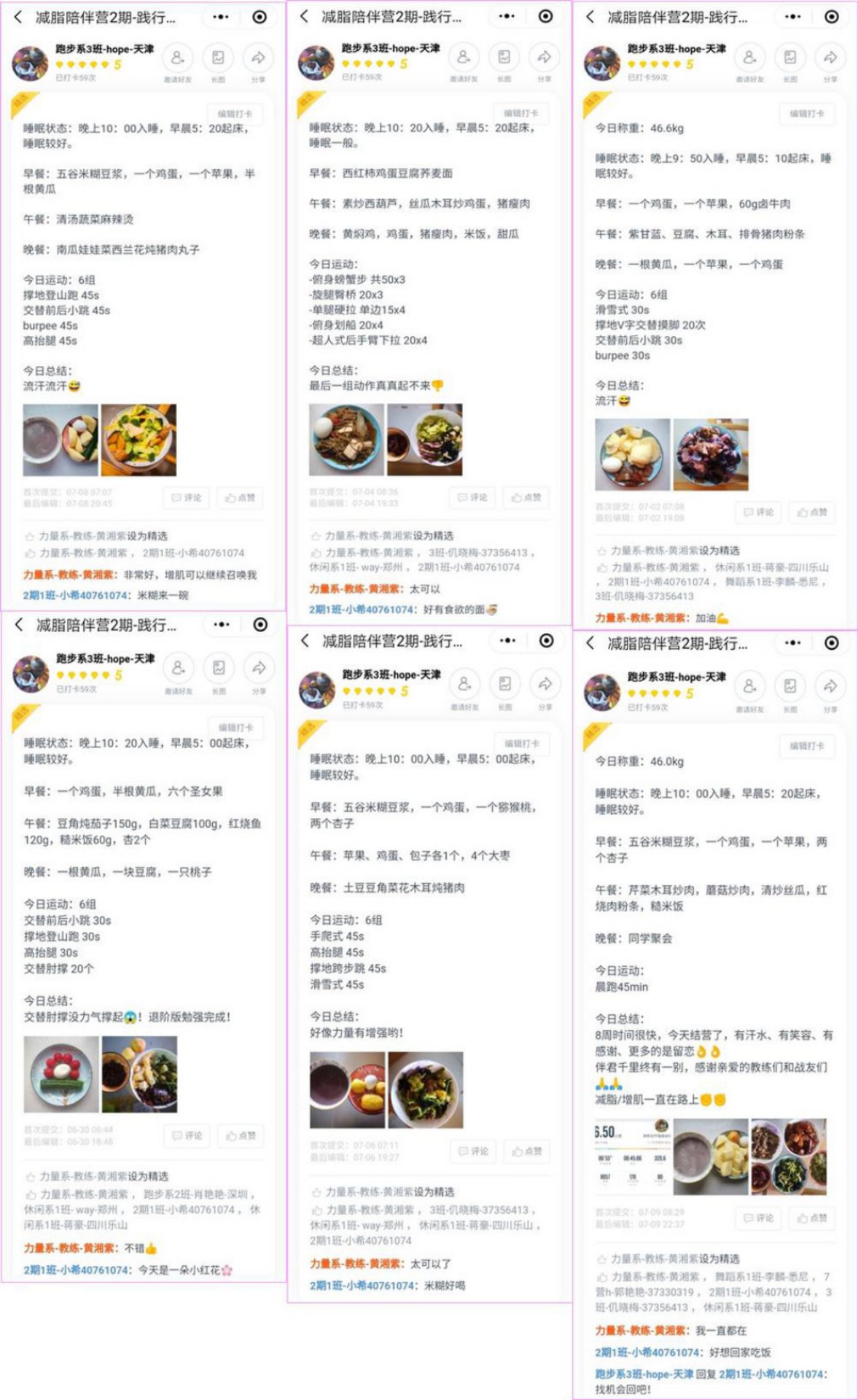 改变从注重健身,主动学习科学饮食开始。 今年3月,我加入定投健身8营,每天完成健身并按时打卡,从未阶断获得了运营组送出的惊喜。 5月,我加入了减脂营274班,认真学习相关课程内容,积极参与群内互动,坚决践行饮食要求,两个月的时间,完成了科学饮食知识体系上的首次闭环,体重从50. 5公斤,减至46. 5公斤,腰围从72公分减至67公分,获得了本期的极致践行奖。 可谓收获颇丰。
