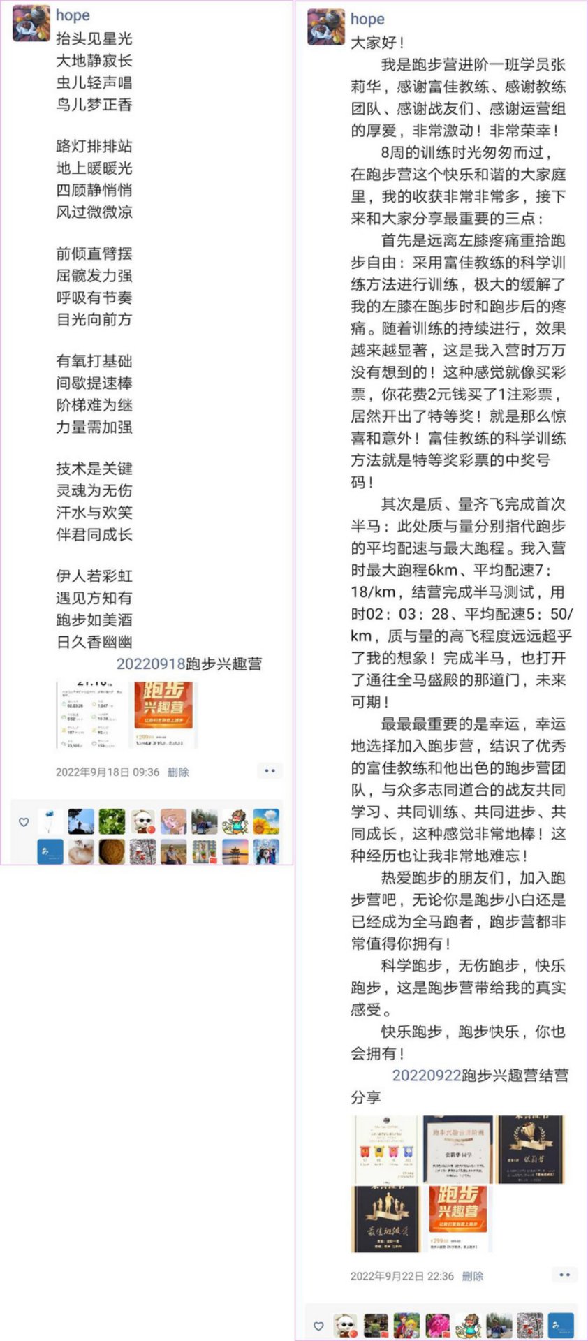 此前,我的朋友圈一直记录生活感知,从未有过例外。 9月18日期末半码测试后,我发了第一条记录运动感悟,只有点赞,没有人咨询。 9月22日、一期结英仪式后,我发了第二条上传了我在结英仪式上的发言稿。 这次有朋友开始电话咨询,同事也开始当面咨询,最终有4人选择加入跑步兴趣营学习。