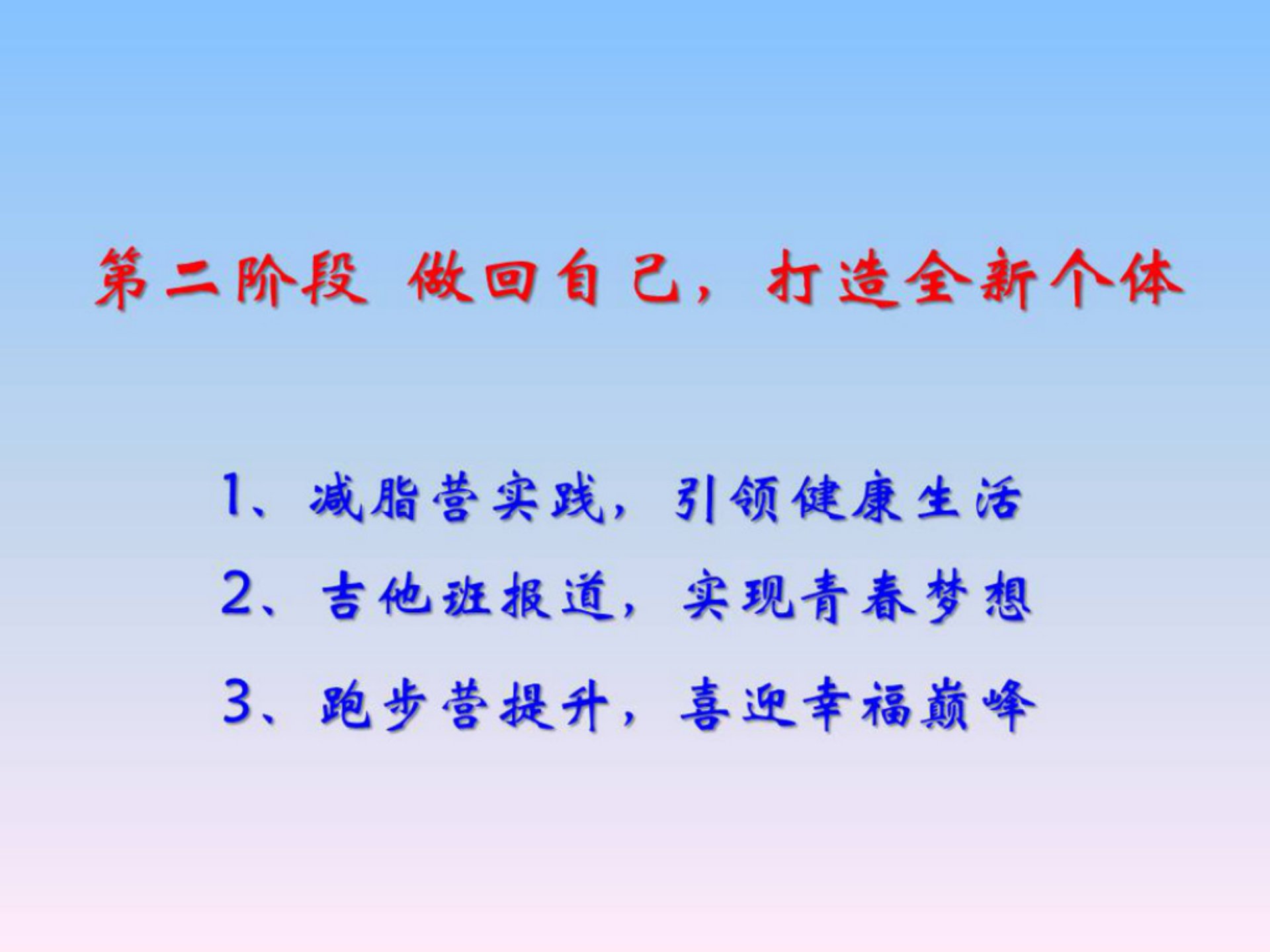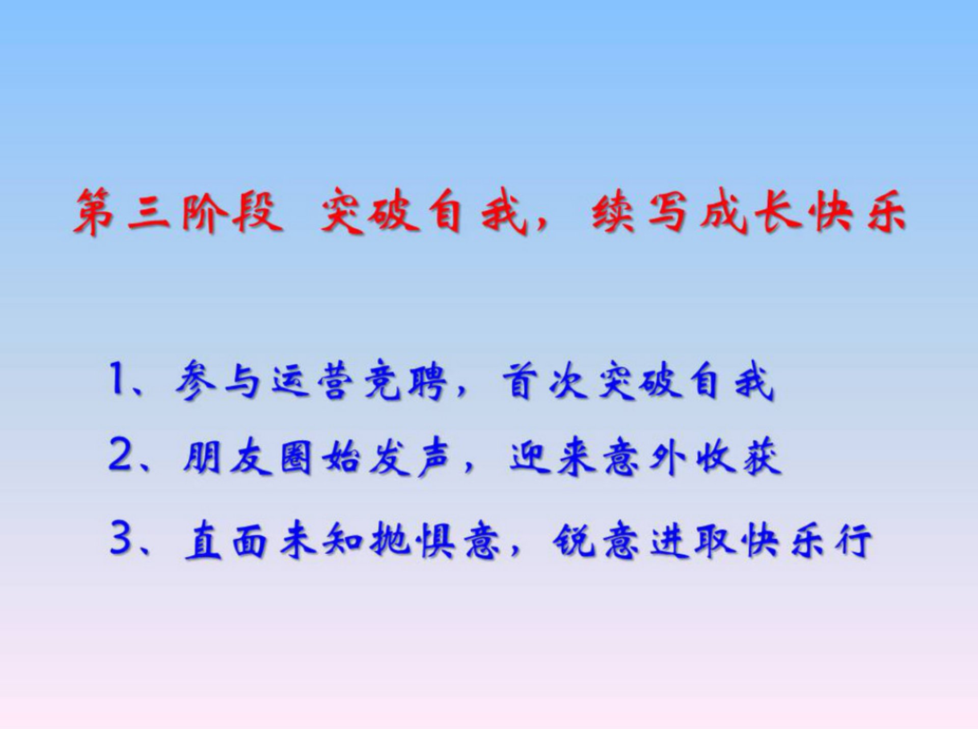 一、参与运营竞聘,首次突破自我,我性格偏内向,深受家人和朋友关爱,生活中多处时间处于被照顾的角色,缺乏主动去帮助别人的观念。 但是加入定投人生课堂后,我越来越深的感受到了优秀群体对个体成长的巨大推动作用。 尤其是在跑步性去营。 我在收获巨大进步的同时,也被团队的魅力深深感染,从内心里想融入其中,想和这个优秀的团队一起去帮助别人一起成长。