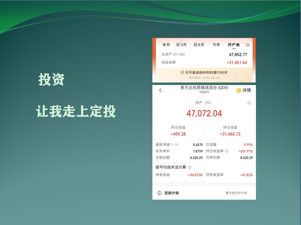 有了这些经历,我更加坚定了定投这条路,我会一直走下去。 不管是在定投成长还是定投财富方面。
