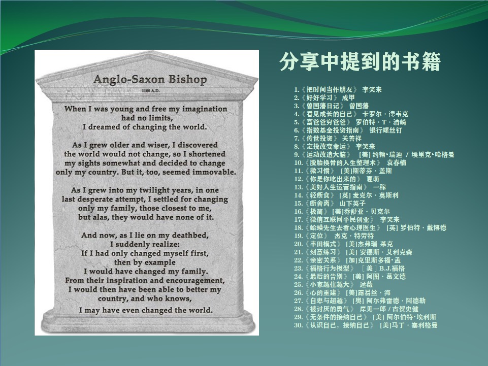 当我年轻的时候,我的想象力从没有受到过限制,我梦想改变这个世界。 当我进入暮年后,我发现我不能改变我的国家,我的最后愿望仅仅是改变一下我的家庭。 但是,这也不可能。 当我躺在床上,行将就木时,我突然意识到: 如果一开始我仅仅去改变我自己,然后作为一个榜样,我可能改变我的家庭; 在家人的帮助和鼓励下,我可能为国家做一些事情。 然后谁知道呢? 我甚至可能改变这个世界。