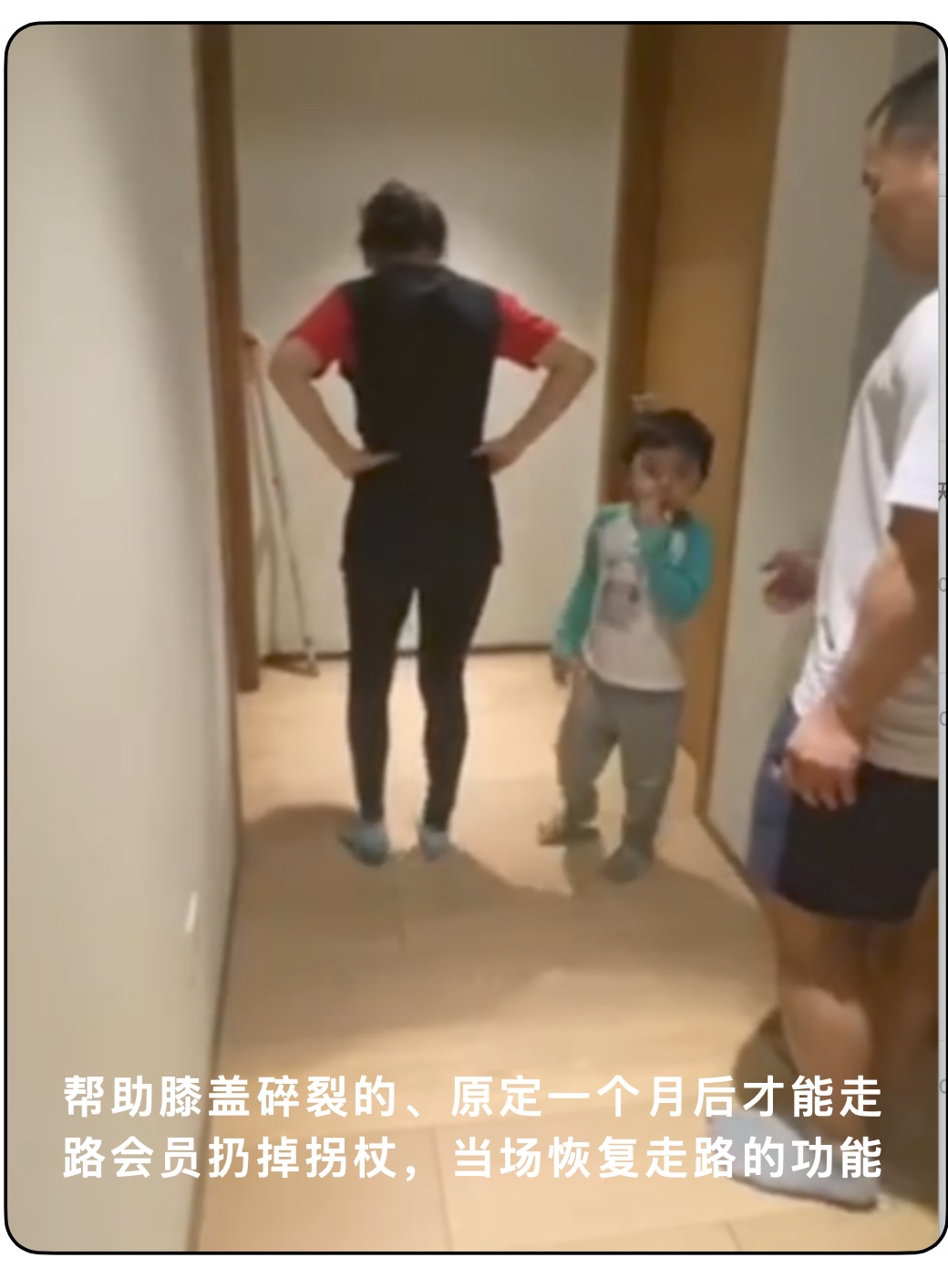 还有一个从东莞来深圳的会员,之前去了多家医院都没有解决他的肩颈问题,严重到恶心头晕,不敢让父亲知道自己颈椎问题,而一顿饭要出去好几次按摩,松解敲打自己的颈椎,他过来一次之后就大大解决了他以上的这些肩颈问题 。 还有那些膝盖碎裂的,小腿肌肉拉伤而需要拄拐杖的。 脚踝扭伤,腰部扭伤,需要有人扶着才能走路的,都很好的帮他们恢复生活自理,行动自由的功能。