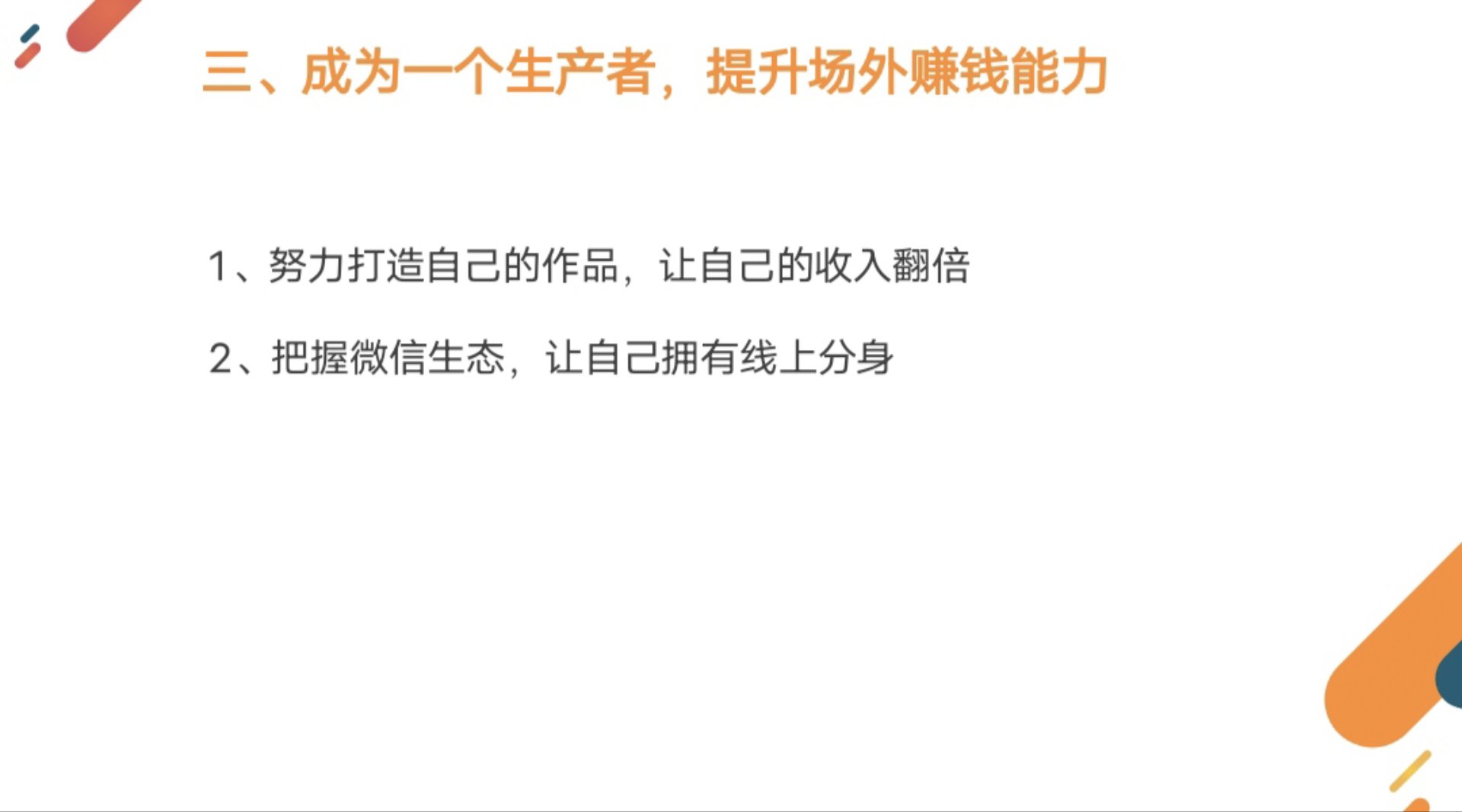 第三,成为一个生产者,提升场外赚钱能力,努努力打造自己的作品。