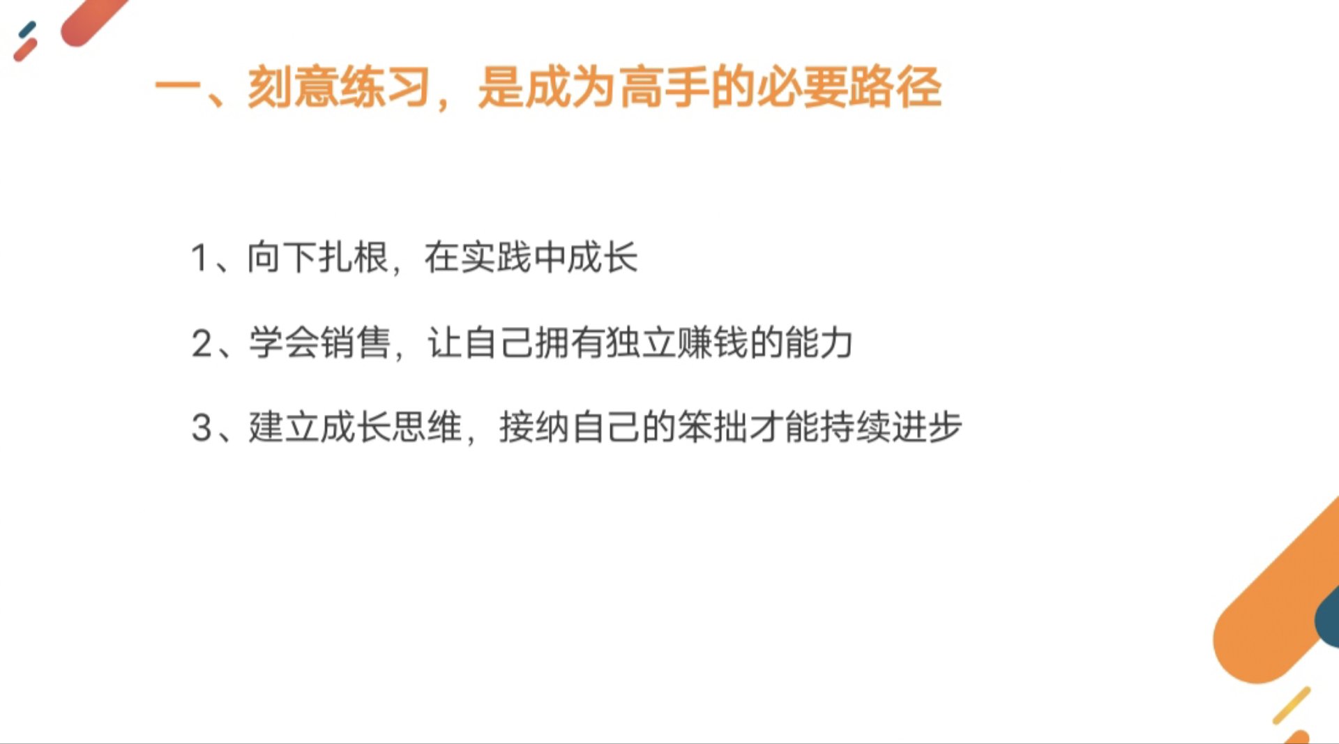 我看了校来老师推荐的日本NHK的纪录片行家本色,发现天赋对于高手来说固然必不可少。 但是他们付出的努力也远超常人种子在发芽之前,必然有一段在黑暗的泥土中扎根的阶段,根扎的越深,未来才能长得越高。 因此,我沉下心来在一年中完成了100多个个案咨询,参加了200多小时的督导和团体活动,咨询的技术和状态都得到了提升。 同时,咨询也给我后续的销售工作打下了基础,倾听提问教练技术都可以在销售中得到非常好的应用。