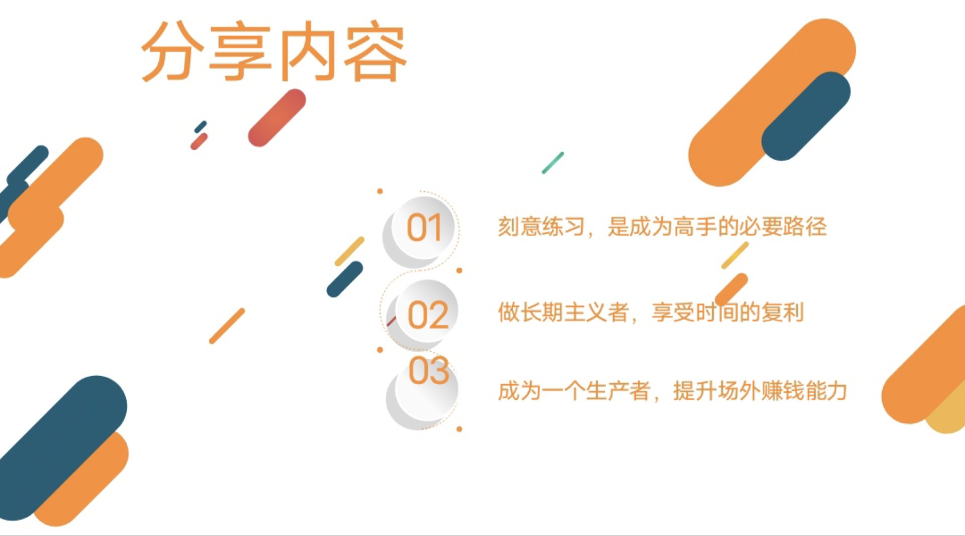 总结: 在定投课堂的短短2年时间里,我从一个职场人变成了一个轻创业者,从线下走到了线上,拥有了更健康的身体和更灵活的头脑,拥有了更加优质的人脉圈子,学会了保护自己的注意力,建立了产品和服务的思维,学会了销售,学会了短视频和直播,在未来的个人发展中拥有了更加稳健的地盘。是定投人生课堂帮我开启了人生下半场的另一扇门。