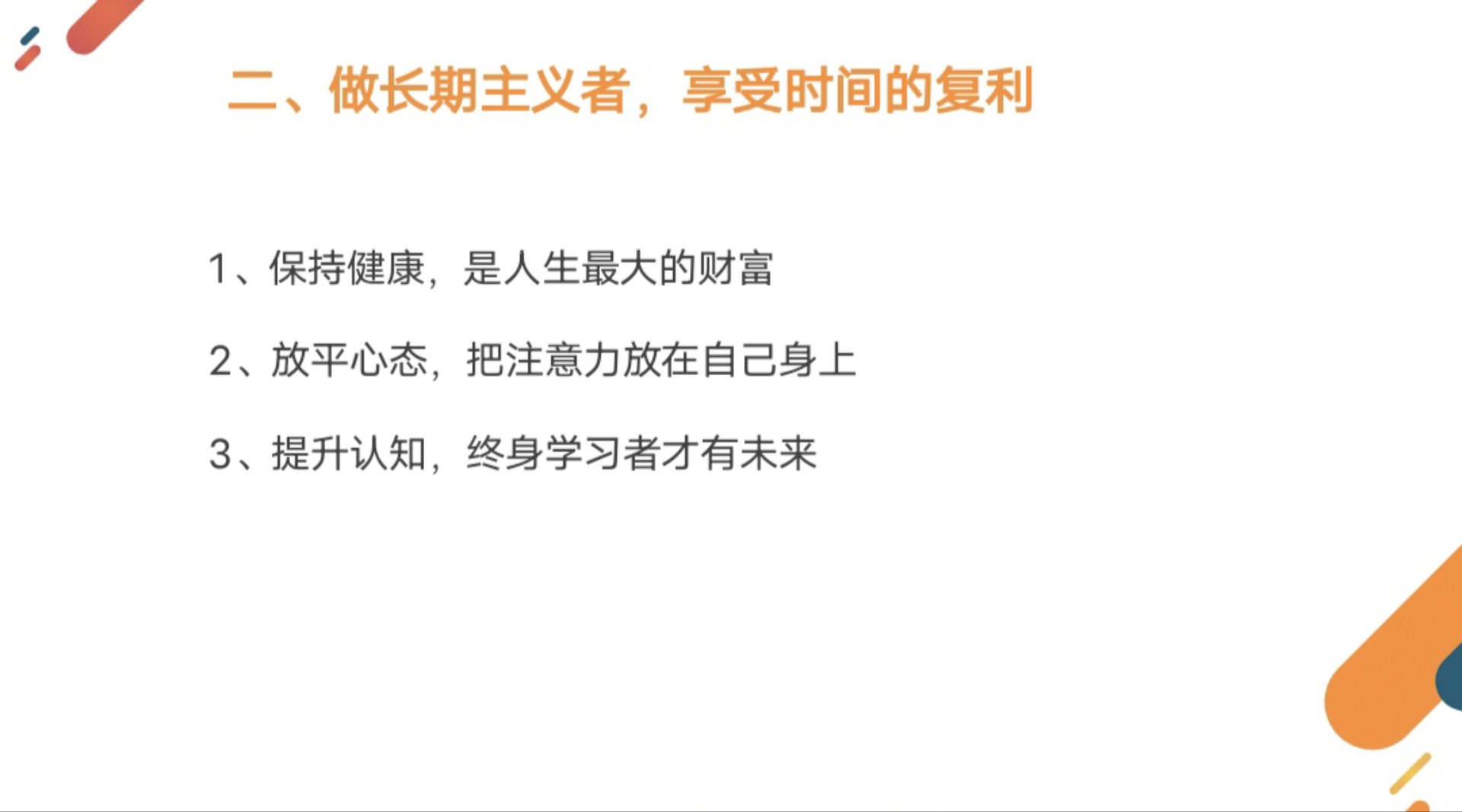 第二,做长期主义者,享受时间的福利。 人生最重要的三件事是财富、健康和幸福。 而这三点,在定投课堂的价值观中有非常具体的体现。 读书健身、投资,帮朋友陪家人。 人生真正重要的事情并不多,但每一件都值得我们花时间去经营,而定投就是最佳方式,不需要打鸡血和焦虑,每天投入一点点,日积月累就会有可观的收益。