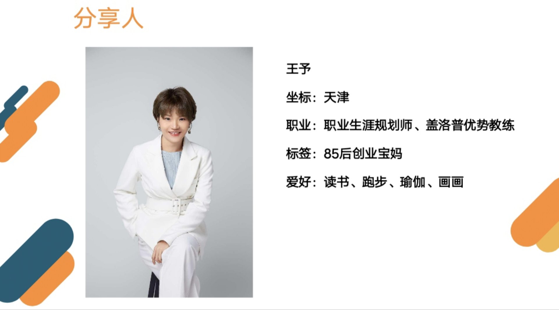 各位战友,大家好,我是王予,坐标天津,是104班的班委,是定投人生课堂7年间谍群成员。目前是一名职业生涯规划师、盖洛普优势教练,也是一名自由职业者。我35岁从体制内辞职创业,1年内完成100多个咨询个案,帮助用户解决职业转型和发展困惑。