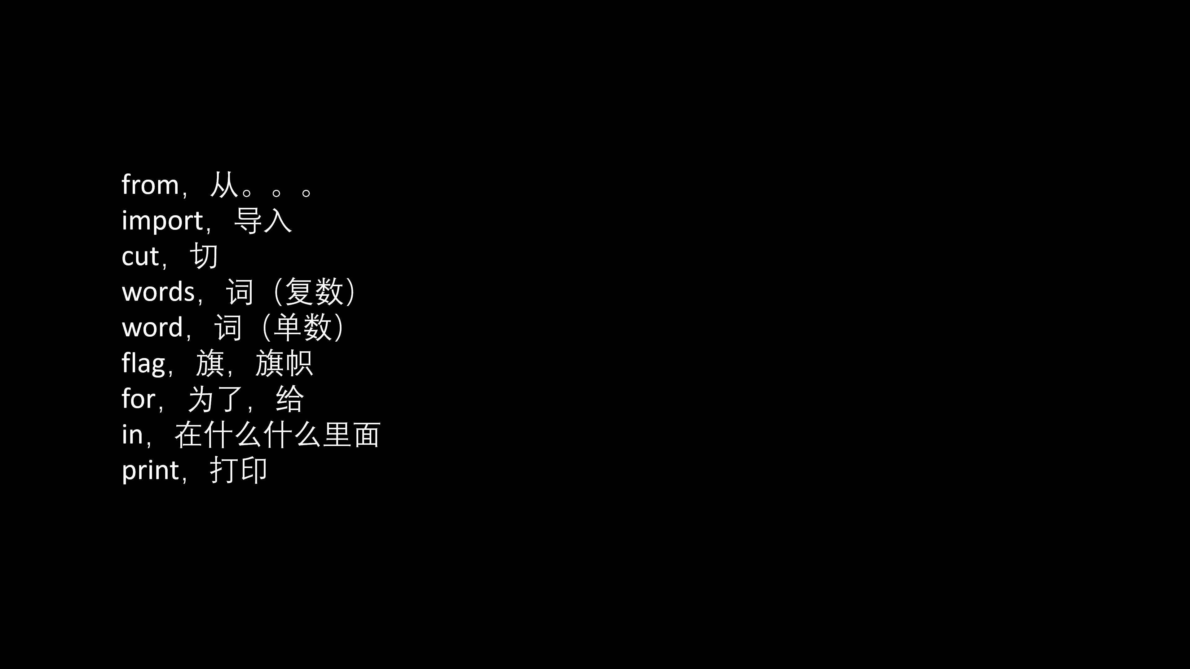 首先嗯第一行是一个引入工具的过程啊。 那么from什么什么,然后import,那就是从哪里导入什么的意思。 那么这一行呢,我们正在告诉计算机。 我们需要从一个叫做呃结巴点posage的工具箱引入一个叫cut呃工具。 那么就像我们生活中需要用刀切东西,那么这里面呃我们需要用cut来切文字。 。