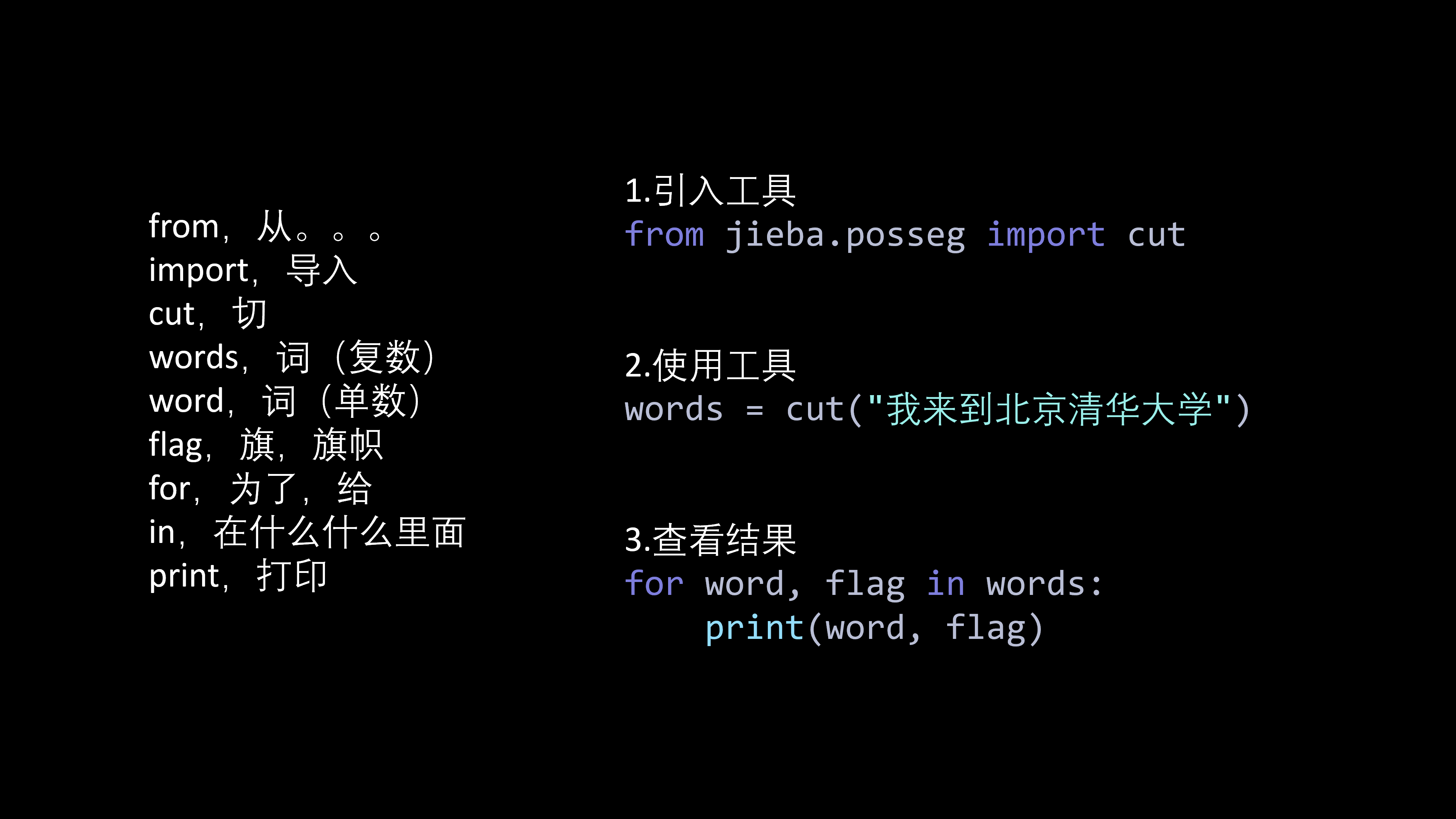 第二行呢嗯是使用工具。 那我们使用cut这个工具呢来切分一句话,就像把一句话切成一块一块。 每块呢都是一个单独的词。 那么这里呢我们把我来到北京清华大学切成一个个单独的词。 然后我们把这些切出来的词放到一个叫words的盒子里面,。