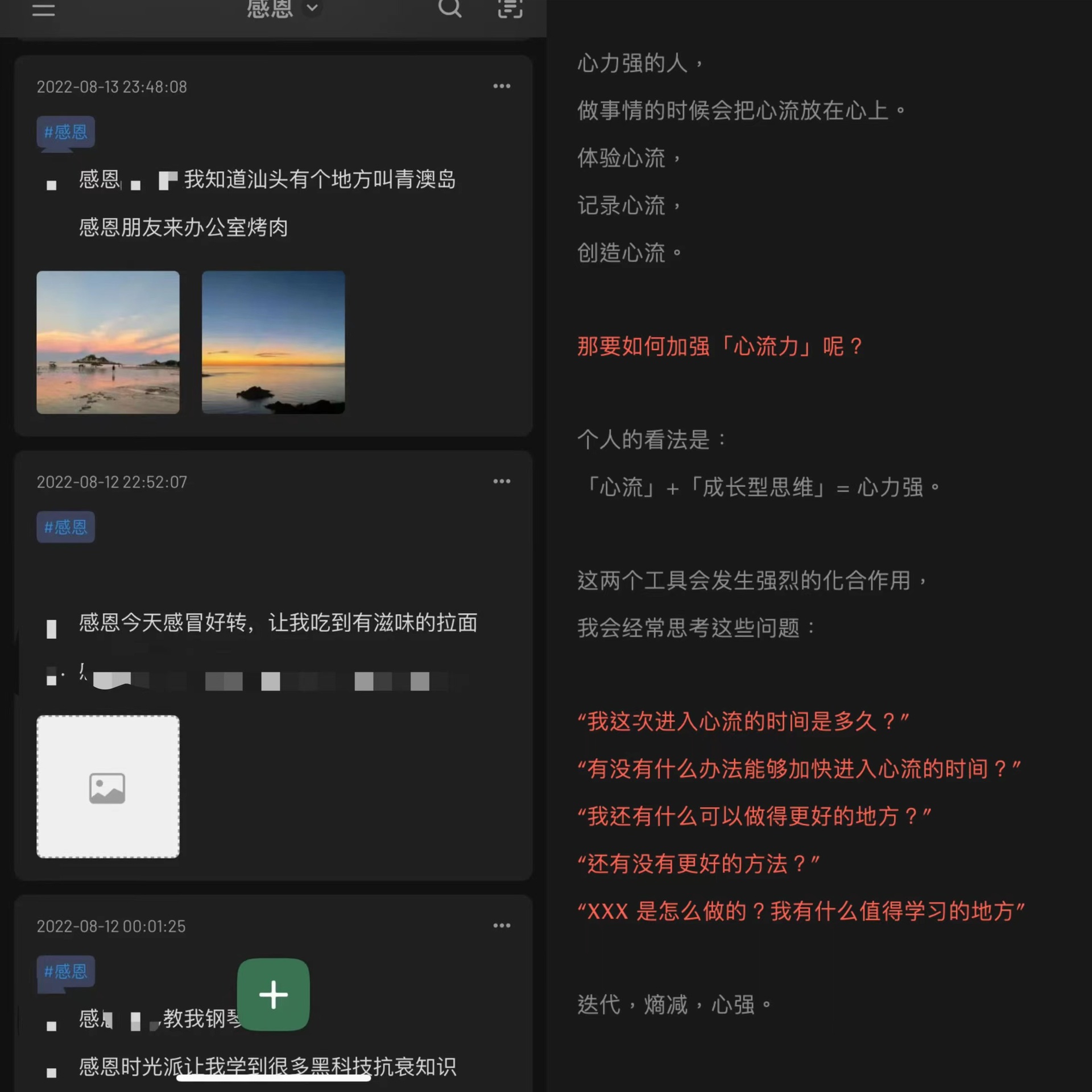 当你能够成功进入了心流的状态,就意味着200%的创造力极度的专注。 这个时候简简单单的一个小感恩,一个小成就,你都能够写很长很长。 所谓的文思全涌,其实就是在这样的情况下产生的。 因为心流的存在,你这段时间是很开心的。 在做这件事的过程中就能收获到正反馈。 。