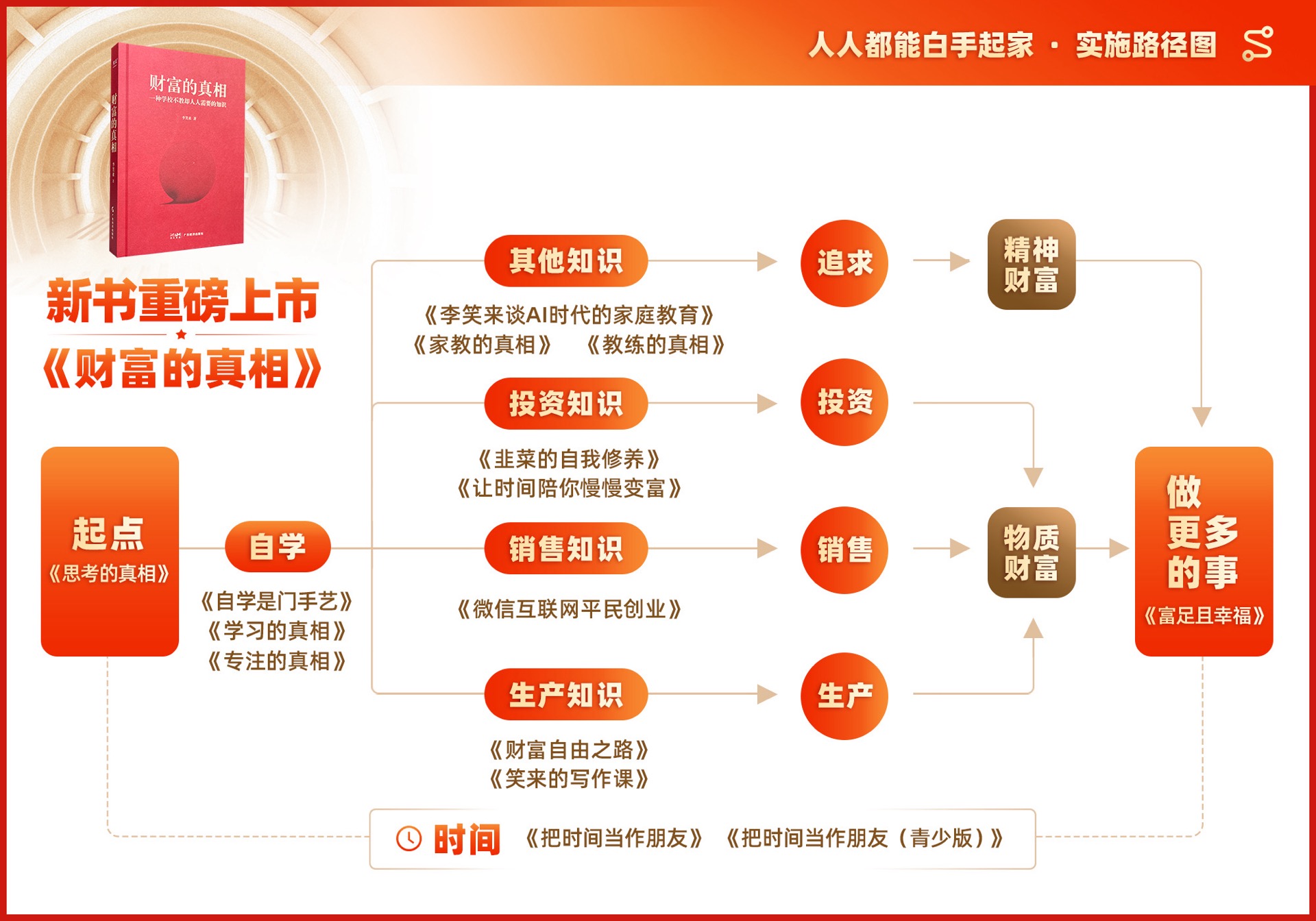 在我们的新书啊,财富的真相里啊,有一张人生地图,那张人生地图呢也可以简化的化为这样子,你就可以看得到哈。 在过往的时间里,李下来的所有的创作,其实呢逐步的构成了一个体系,对吧? 从把时间当做朋友开始意识到今天啊,大概都已经哈两辈子过去了,对吧? 在此之前呢,还有一辈子在创作,对吧? 那恨不得20年左右的时间 然后呢,逐步的变成了今天的这个样子,对吧? 然后呢,大家可以去可以看到的是什么呢? 就是在财富的真相里,我们有一个惊人的结论,什么呢? 就是我们这一生所有的财富,不管是物质财富还。