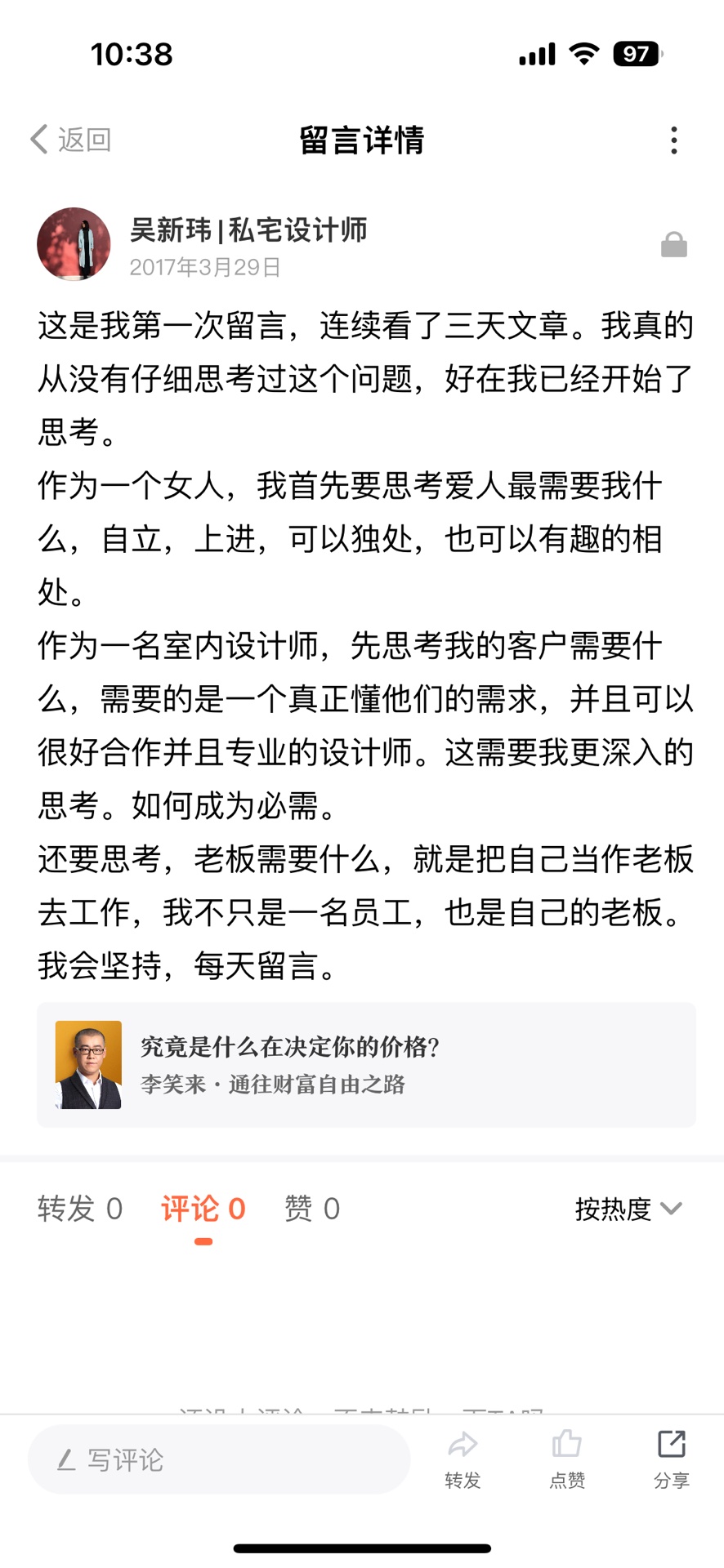 但我在复盘专栏的时候,看到创业的内容时,又很希望自己有一天能脱离公司彻底独立。 在这样的踌躇中,通过写作,我连接到了一位设计行业里的前辈,这一年呢,我们只是加了微信,没有过多的交流。 然后在第二年的年底,我再复盘也及是发现,我已经有80%的产值,是自己的转介绍了。 我用到公司的资源越来越少。 第三年年初开始上班后,我在第一周的时间里就接到了十几户客户的转介绍咨询,已经接待不过来。 刚好这时前面提到的设计前辈有线下课,我毫不犹豫的付费参加。 在3月学习,然后我在5月就提出了辞职,开启了我小美的设计工作室之路。 一转眼啊,我成立自己的工作室也要5年了。 如果说我没有每年复盘专栏,没有没有去写作践行。 然后那我的职业成长是不会这么快的,非常的感谢小兰老师。