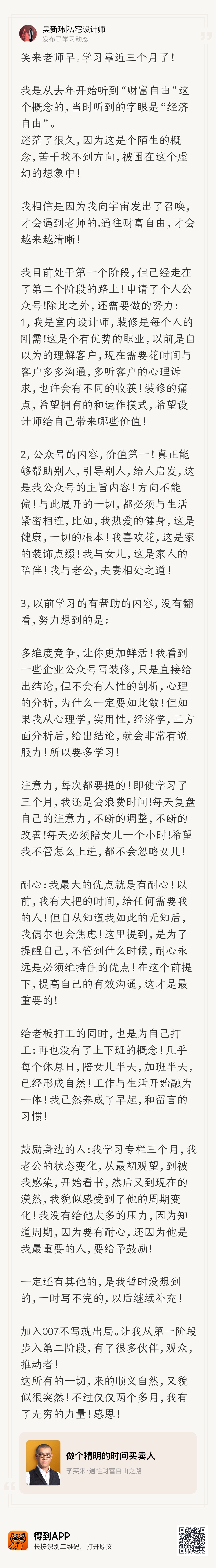 就像校来老师说的,写作是普通人成长的最好方式之一。 我通过写作,把自己在设计工作中的思考变成文字。 第一篇专业文章就是写的儿童房写作他锻炼了我的学习能力、思考能力、分析能力,还有与客户的沟通能力。 我开始付费学习啊,对自己进行自我的分析,当下缺什么就补什么学习之后,我会很快的运用在跟客户的交流中,再把交流中有价值的思考,写作文章,这让我的学习非常有针对性,而且吸收很快。 专栏里有52个概念,我一直是一边学习一边践行。 在通过写作加深理解,慢慢的就体会到了笑来老师说的融会贯通的神奇。