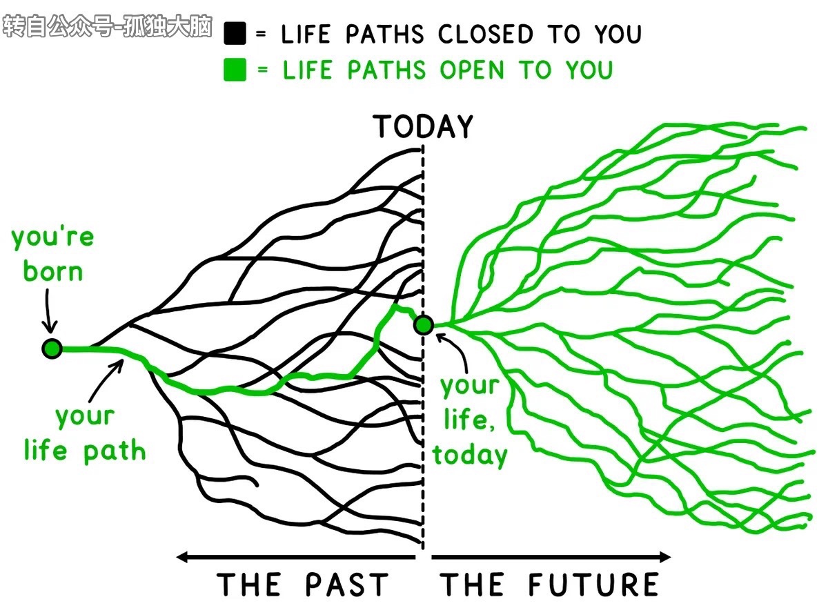 人生路就像是一个不断分岔下去的扇行数岔,其中每一个岔路口都对应着一次选择,一次又一次的选择,最终形成了今天的继承路径。 与之对应的就是我们个体所在的真实世界。 而那些潜在的选择方案,则会让人生演化成近乎无数的平行宇宙,我曾多次。