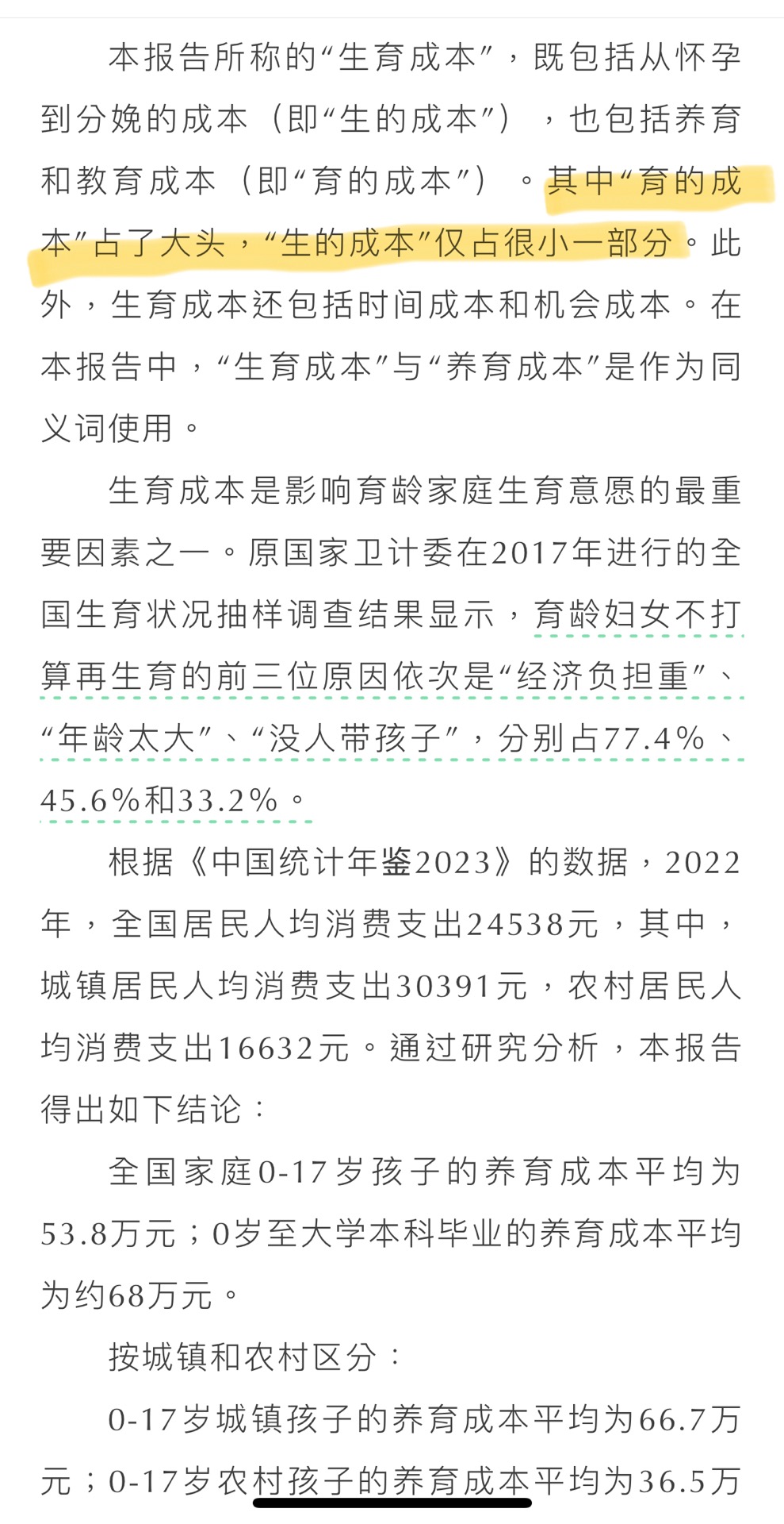 其中呢有这么一小段哈,然后呢他说哈本报告所称的生育成本啊,其实呢不仅包括从怀孕到分娩的成本就有生的成本,它不仅包括这个还包括什么呢? 还包括后面的养育和教育的成本啊,就生和育啊有生的成本有育的成本,所以生育成本哈是这样子的。 然后呢,他说哈其实呢算来之后呢,其中育的成本是占了大头,生的成本仅占很小一部分。