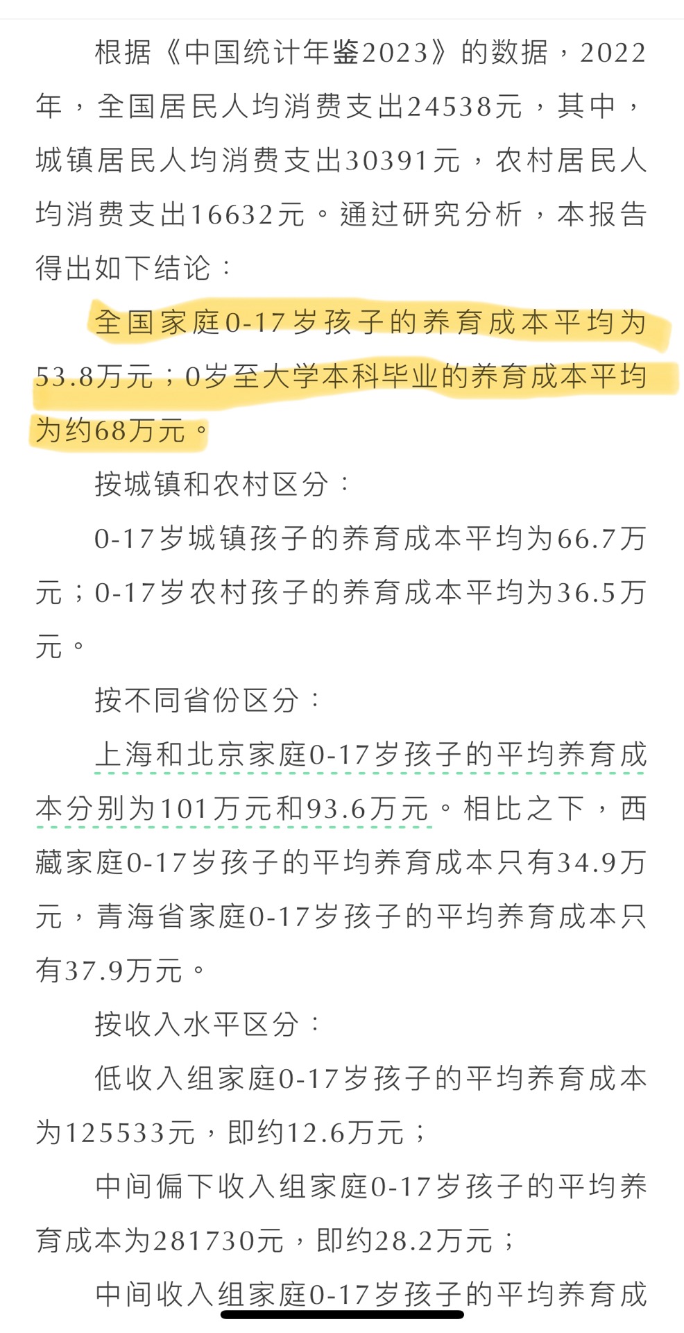 前两天呢读了一篇文章哈这篇文章呢采用的是中国统计年鉴2023的数据哈来重新估算啊全国上下各种的育儿费用。 对。 然后呢,我认真看了一下。